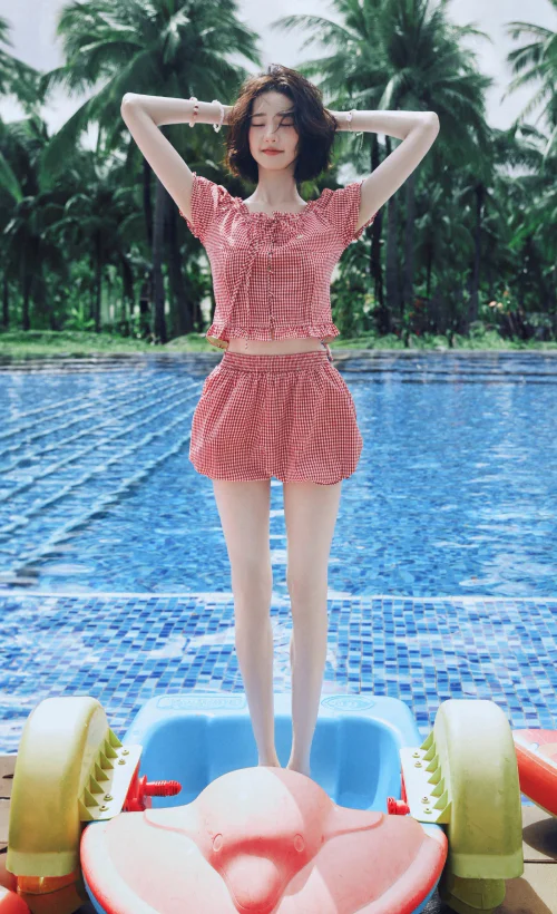 The outfit in the image is a charming red and white gingham two-piece set, perfect for a casual summer day by the pool. The choice of gingham print gives it a timeless and playful vibe, while the crop top and high-waisted shorts provide a flattering silhouette that highlights the waist and elongates the legs.