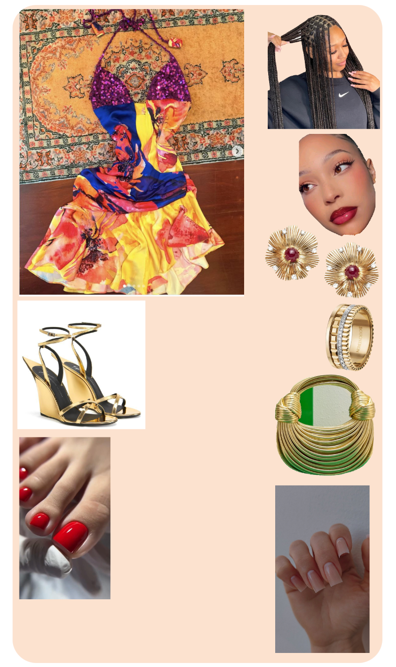 I would rate this outfit an 8.5. The vibrant halter dress stands out with its eclectic mix of purple, orange, and yellow hues, which are ideal for a fun summer event or a tropical vacation. The bold colors and abstract print lend a playful and energetic vibe to the ensemble. The dress's silhouette, with its flared skirt, provides movement and adds to the casual, breezy aesthetic.