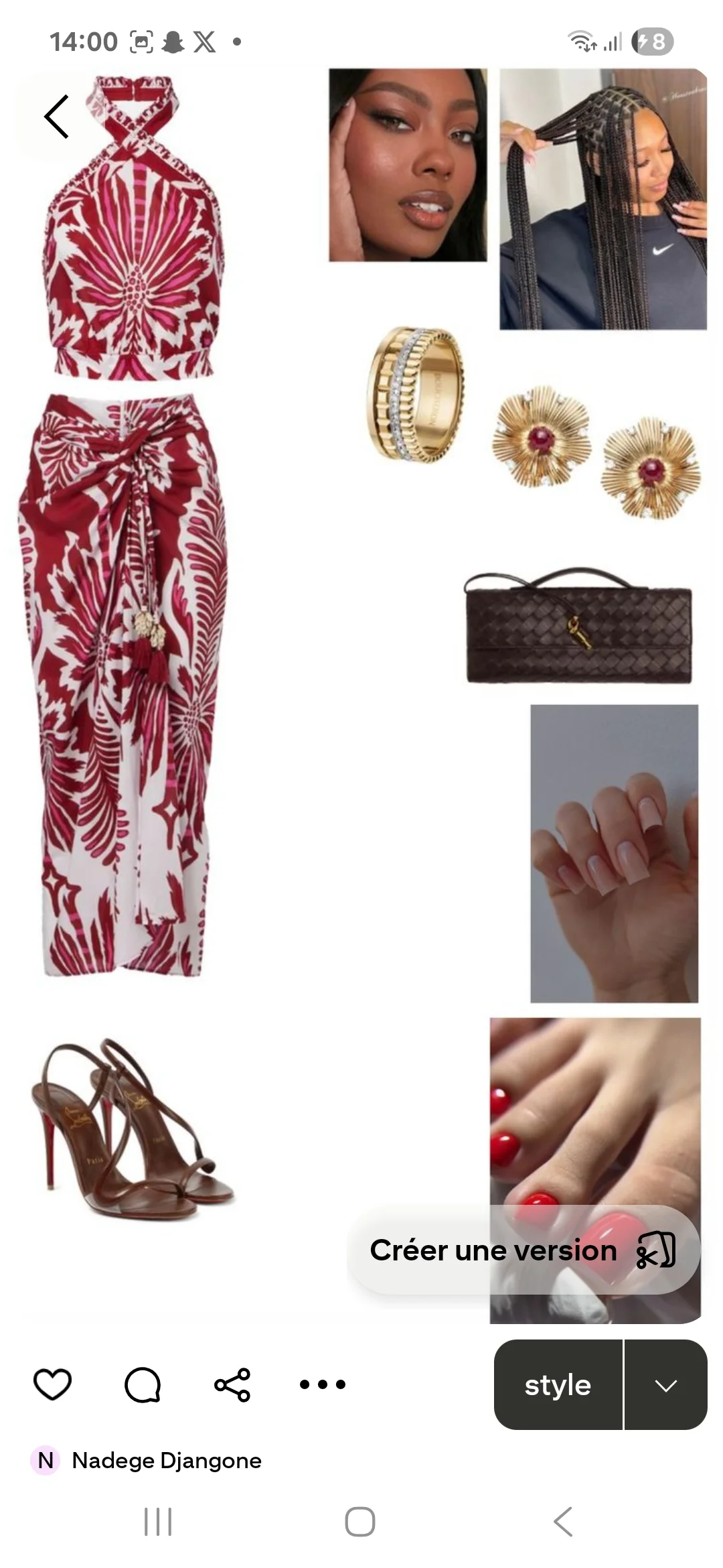 The brown strappy sandals are a good choice as they blend seamlessly without overpowering the main pieces. The muted tones of the nail polish in nude and red coordinate well, though a more adventurous shade could have enhanced the cohesive summery vibe.