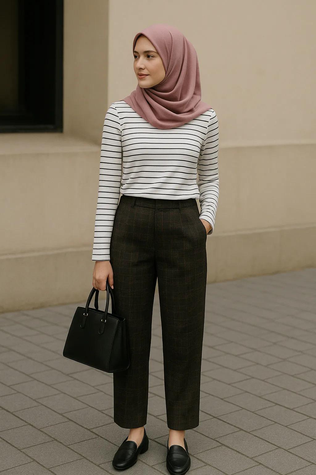 Elegant Pink Hijab Paired with Striped Top and Plaid Trousers for a Chic Look