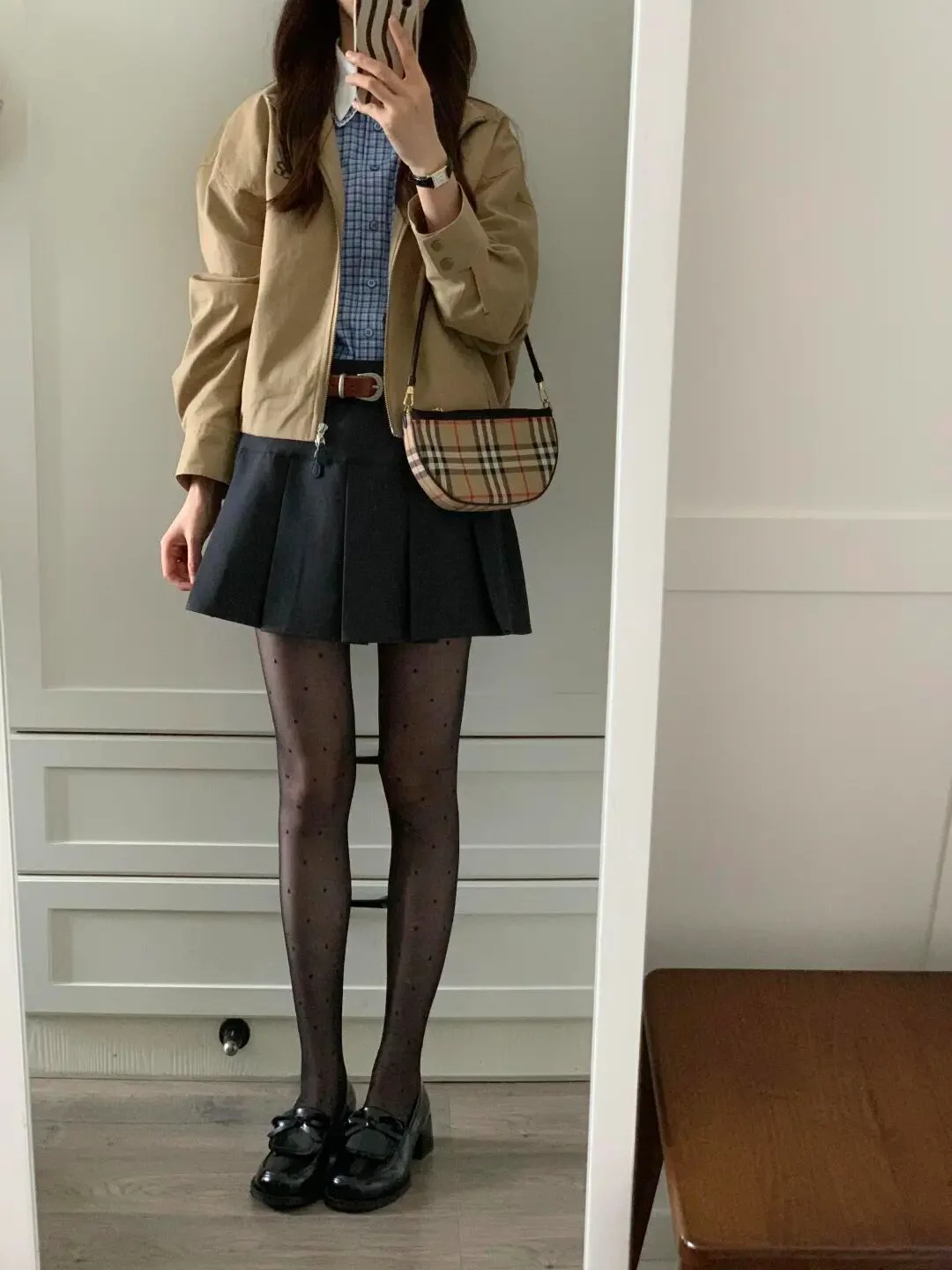 This outfit scores a solid 8.5. The overall look is preppy and polished with a modern twist. The light brown jacket is a great choice for layering, providing warmth and style while not overpowering the outfit. It complements the navy pleated skirt and helps create a balanced color palette. The choice of a collared shirt in a checked pattern adds a classic touch, blending well with the overall aesthetic.