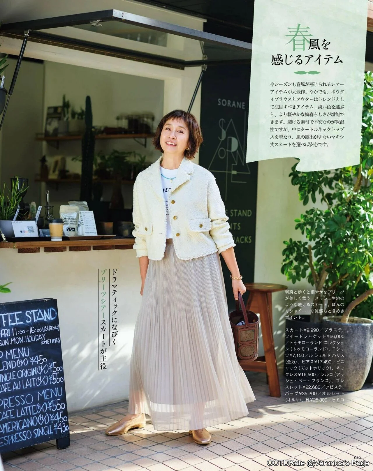 The outfit in this image exudes an elegant and relaxed vibe, perfect for a casual daytime outing. The ensemble features a textured white jacket over a soft, pleated maxi skirt in a delicate grayish hue. This combination is well-balanced, with the lighter top complementing the soft tones of the skirt, creating a harmonious palette that is fresh and ideal for spring.