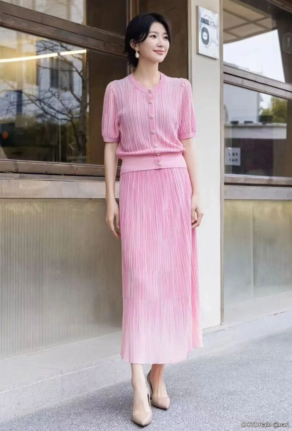 The skirt's length complements the top, creating a balanced proportion that is both modest and stylish. Additionally, the lightweight fabric suggests a gentle movement, adding a touch of grace to the outfit when in motion. The choice of nude heels is an astute one, as it elongates the legs and keeps the focus on the soft pink outfit.