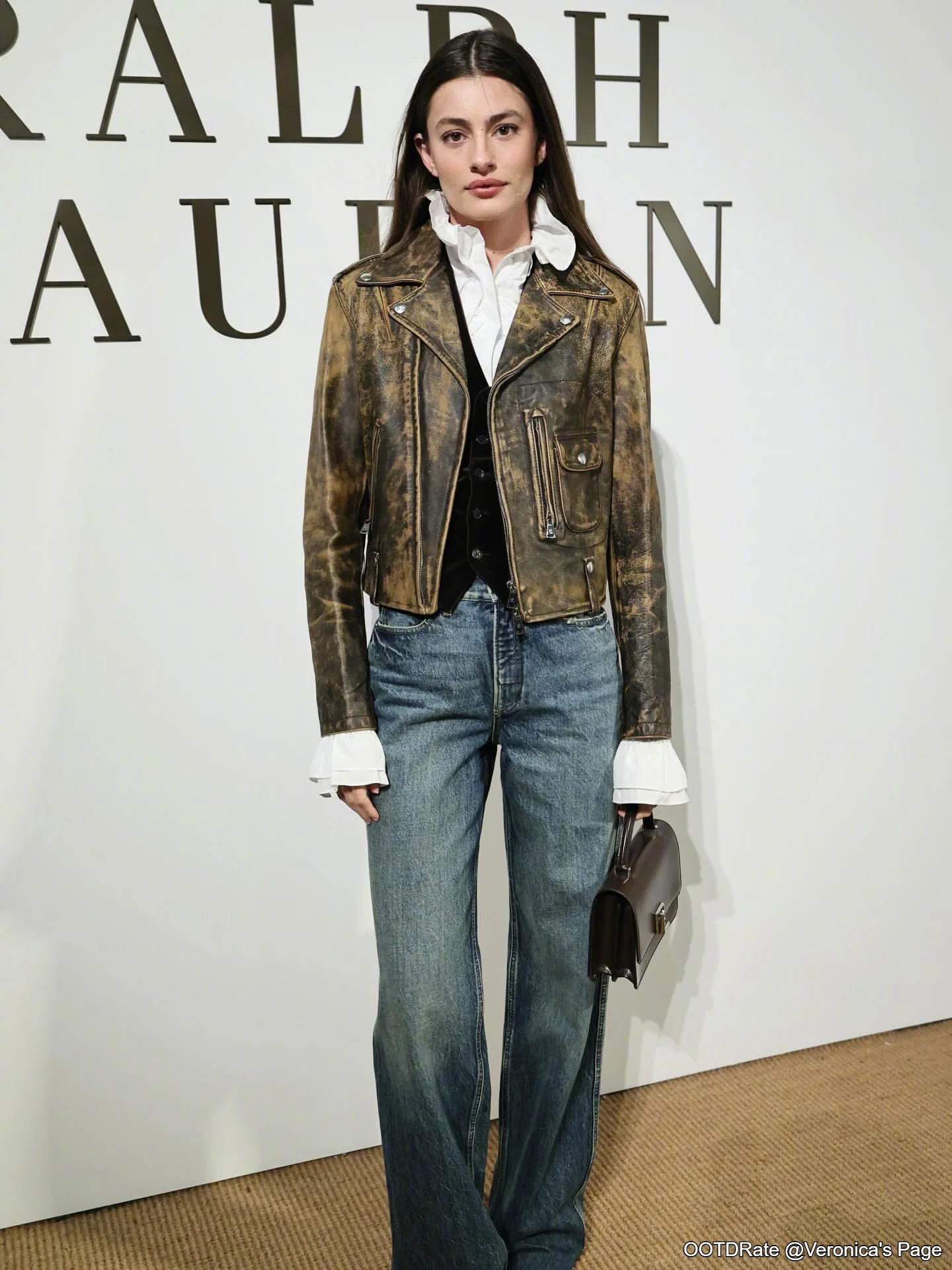 This outfit scores an 8.5 out of 10. The look combines classic elements with a modern edge, successfully blending rugged and refined styles. The distressed leather jacket is a standout piece, offering a vintage vibe with a rich, textured appearance that adds depth to the ensemble. Beneath the jacket, the white blouse and black vest enhance the outfit with a touch of sophistication, creating a balanced contrast to the jacket's ruggedness.