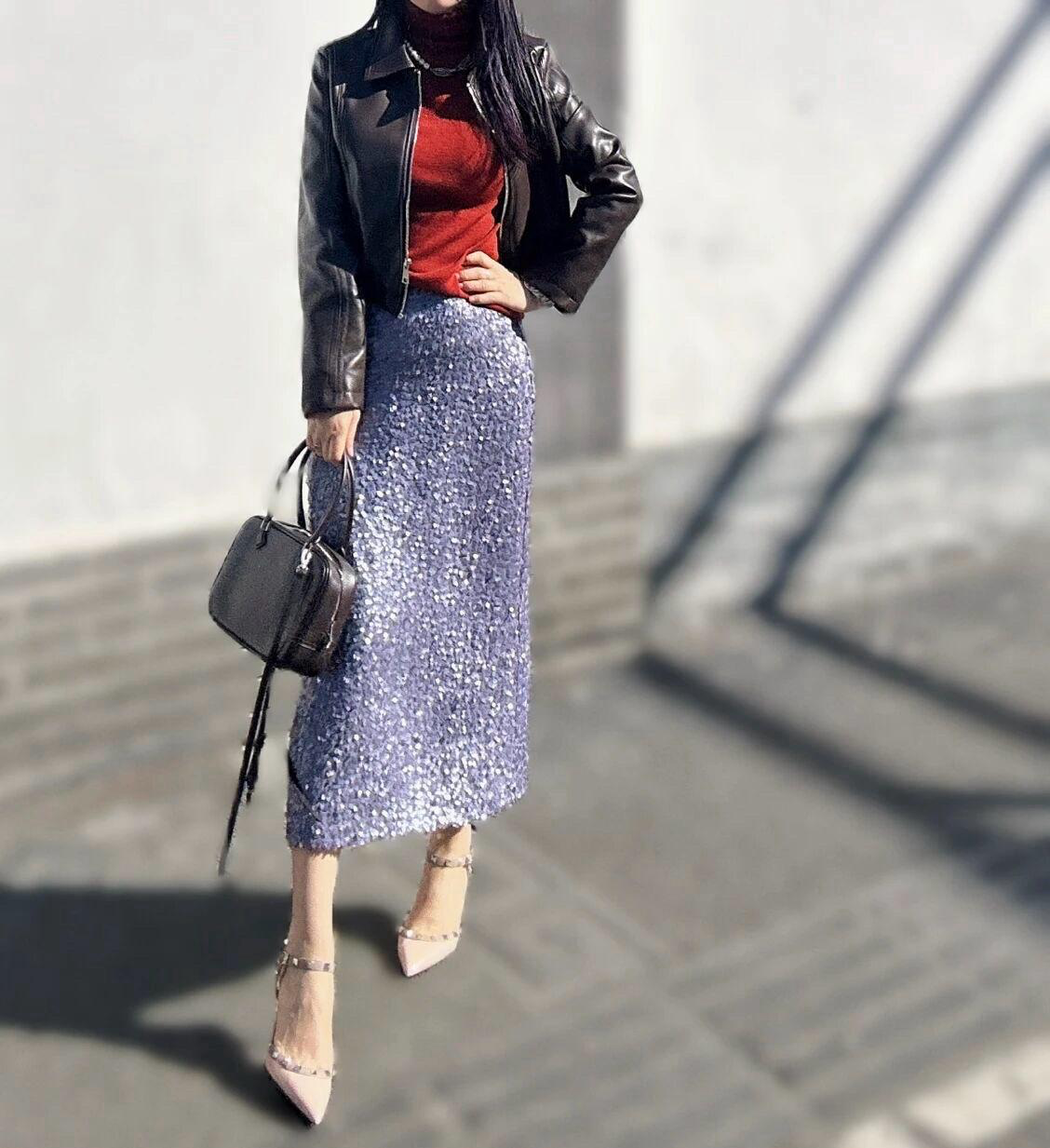 The standout piece is the shimmering blue midi skirt, which captures attention and adds a glamorous touch to the ensemble. Its color and texture contrast beautifully with the leather jacket, making the overall look dynamic and visually appealing. The length of the skirt is appropriate, offering a chic silhouette that complements the other pieces.