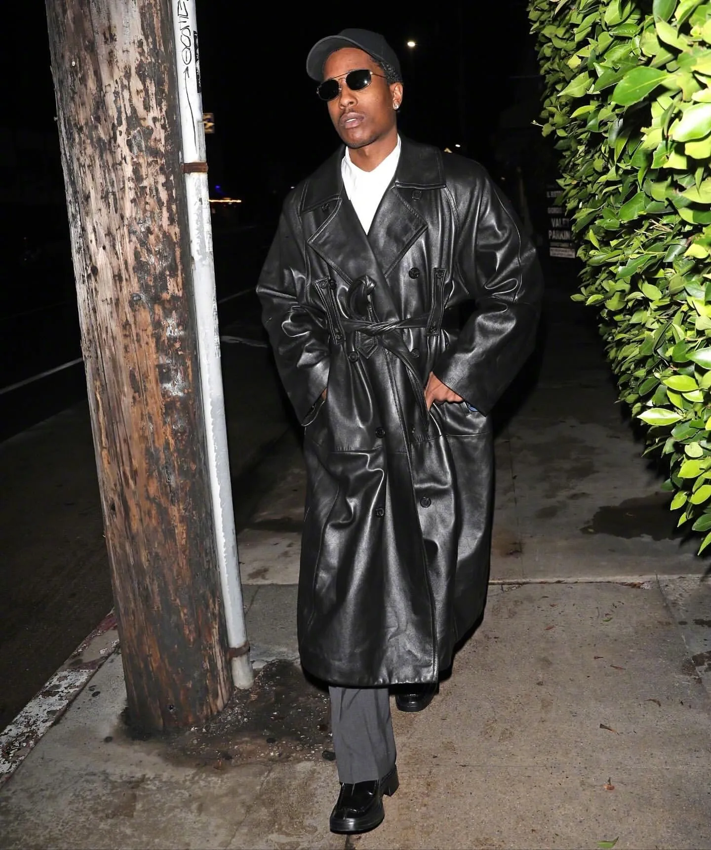 Accessories such as the cap and sunglasses contribute to a laid-back vibe that contrasts well with the luxurious feel of leather, making it versatile for both casual and semi-formal contexts.
