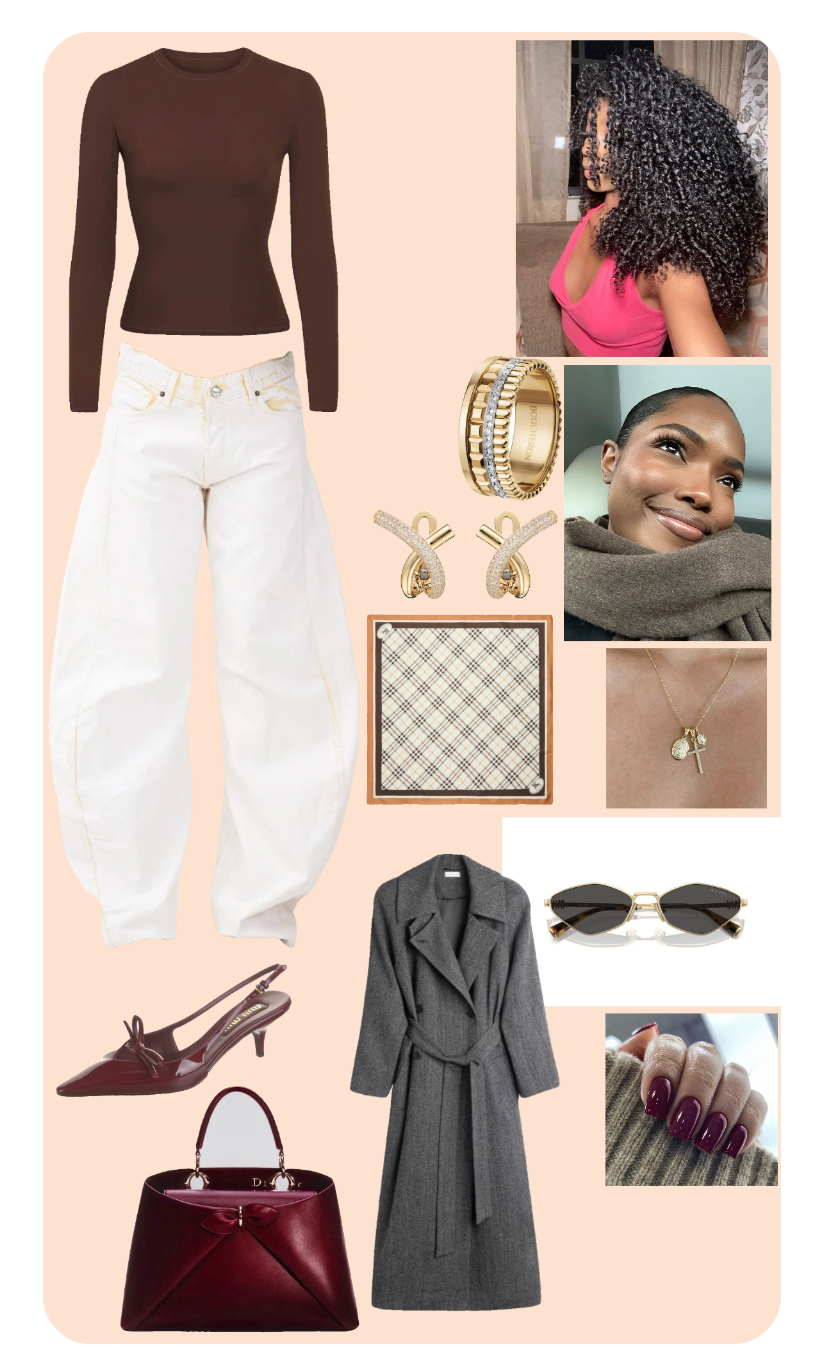 This outfit scores an 8.5. The ensemble combines a rich blend of autumnal and neutral tones with a focus on elegance and versatility. The chocolate brown fitted long-sleeve top creates a sleek silhouette that pairs well with the relaxed fit of the white trousers. This combination balances structure with comfort, offering a modern twist on a classic look.