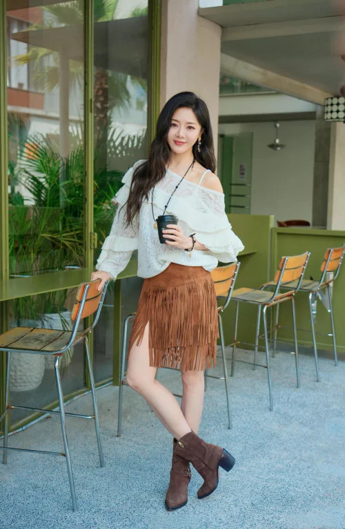This outfit showcases a stylish blend of boho-chic and modern trends, earning a solid 8.5 out of 10. The off-shoulder white blouse with delicate ruffles offers a romantic and feminine touch. Its light color and soft fabric contrast beautifully with the earthy tones of the fringed suede skirt, adding texture and movement to the ensemble. The skirt's length is well-balanced, providing enough coverage while showcasing the legs, perfect for casual outdoor settings or a relaxed daytime event.