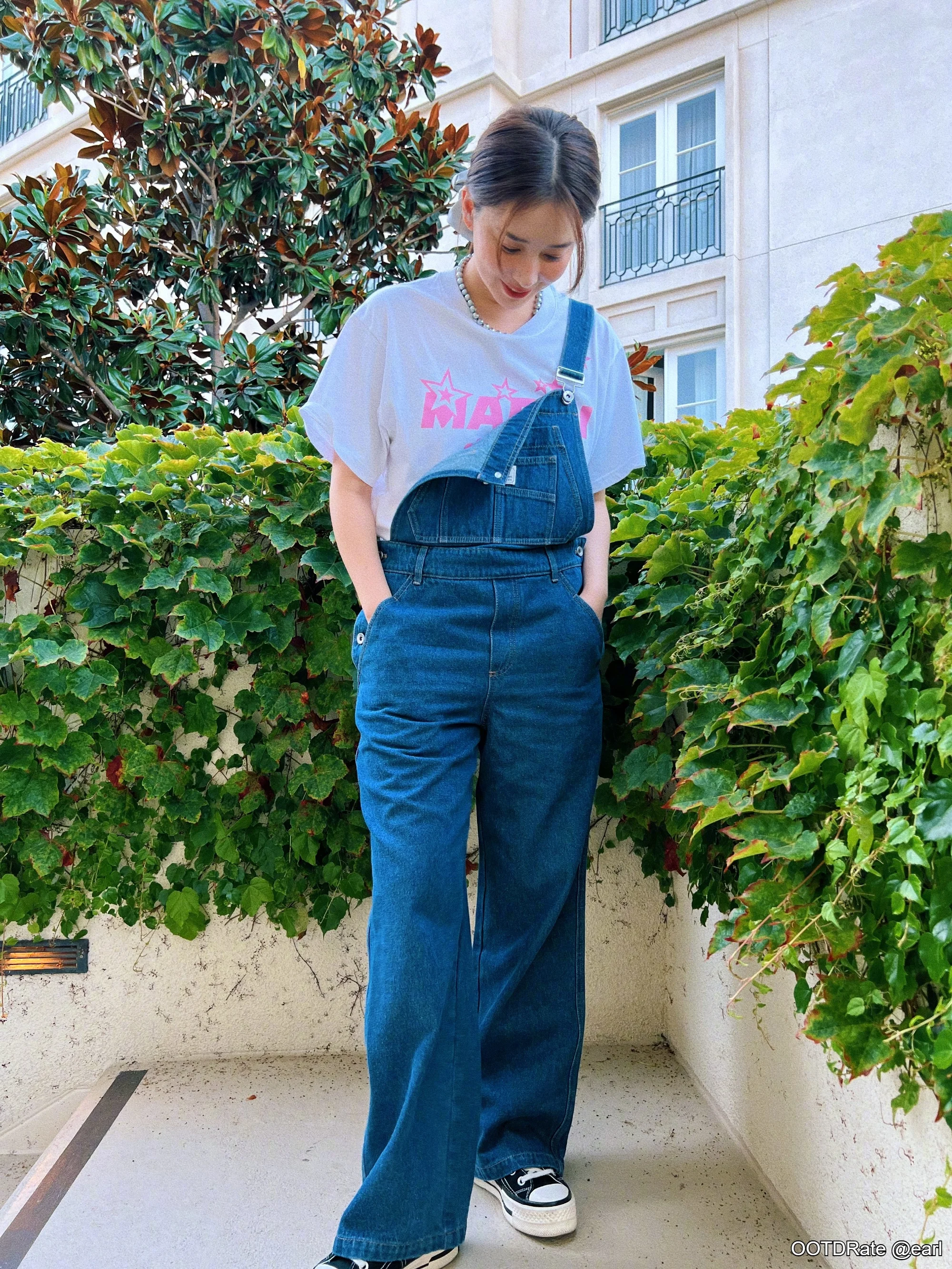 The choice of footwear—casual sneakers—complements the relaxed vibe of this outfit, making it suitable for everyday wear or a casual outing. The sneakers’ simplicity keeps the focus on the overalls and T-shirt combo, and their black-and-white color scheme anchors the look, harmonizing well with the overall aesthetic.