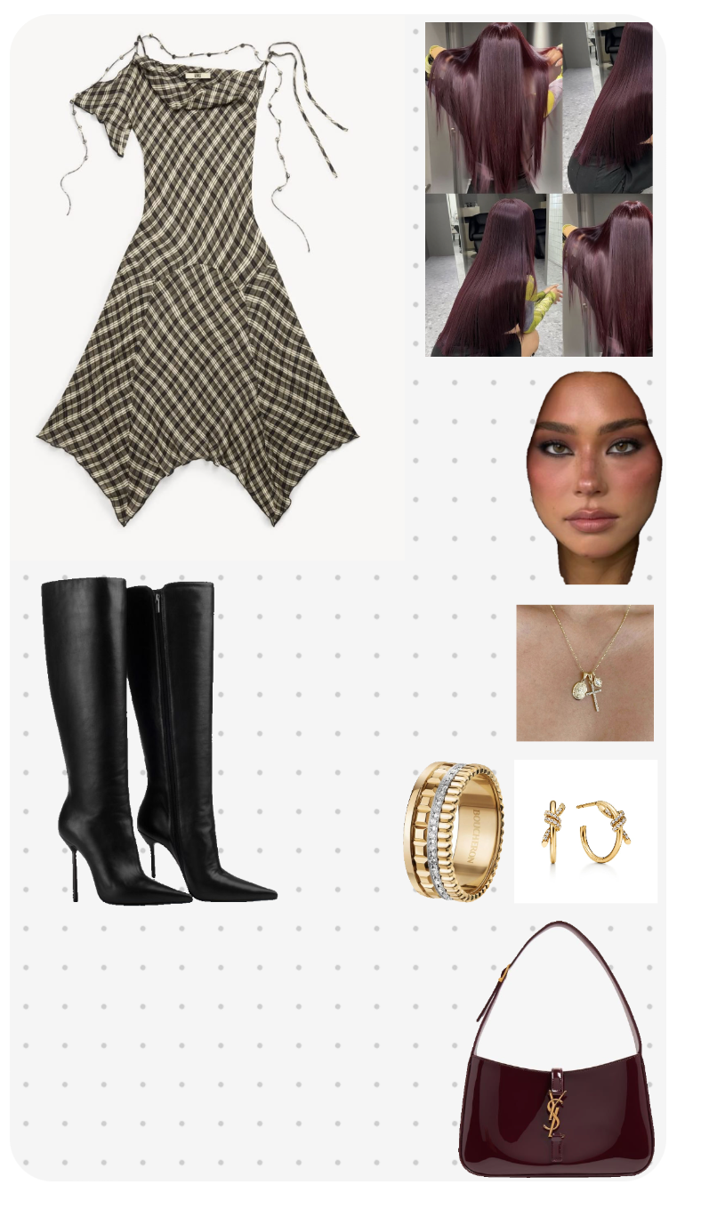 The outfit is further elevated with gold jewelry, including a necklace, ring, and earrings, which introduce a subtle touch of luxury without overpowering the overall aesthetic. These pieces add warmth to the look, harmonizing with the earthy tones of the plaid.