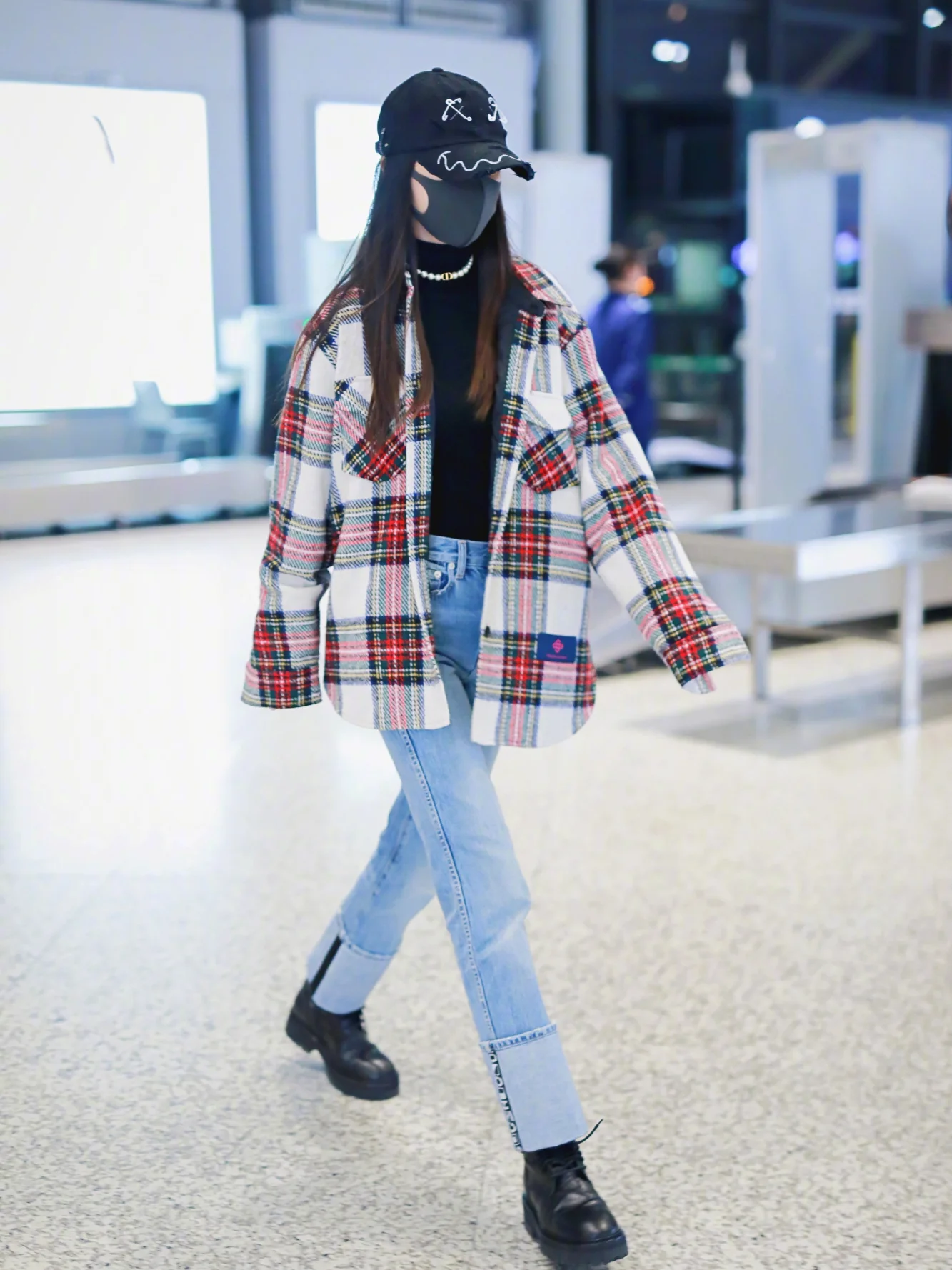 This outfit earns an 8.5 out of 10. The ensemble is stylishly layered, featuring a classic plaid jacket that makes a bold statement with its vivid red, green, and white tones. The jacket adds a pop of color and interest to the otherwise neutral outfit, making it perfect for casual settings. Pairing it with light-wash jeans creates a relaxed yet polished look, balancing the boldness of the jacket.