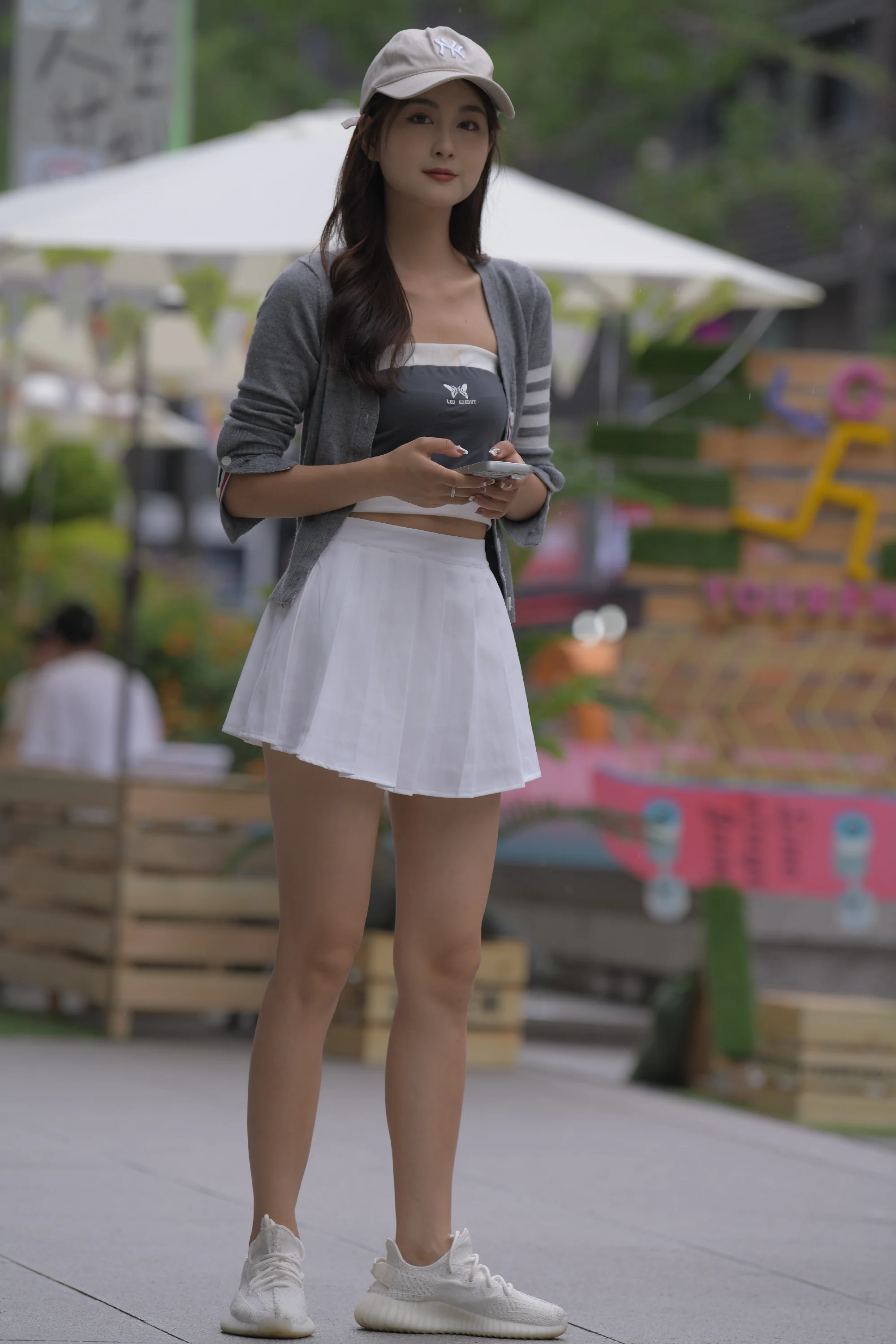 The white sneakers match the skirt and ensure comfort while maintaining a cohesive look. They underline the sporty yet relaxed theme of the outfit. The color palette throughout—gray, white, and muted tones—works harmoniously, creating a balanced and visually appealing style.