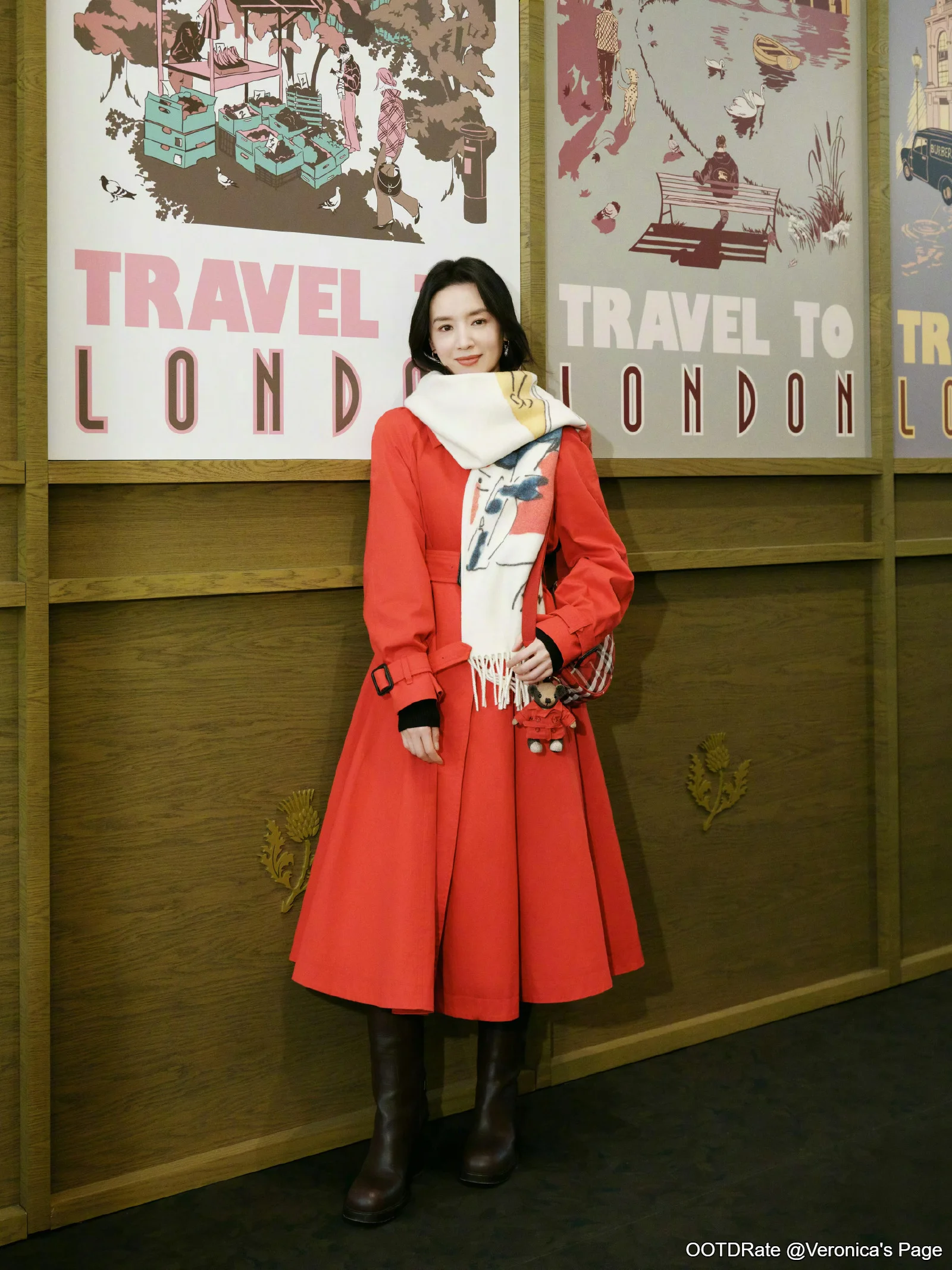 Elegant Red Coat With Artistic Scarf and Brown Knee-High Boots for a Chic Winter Look