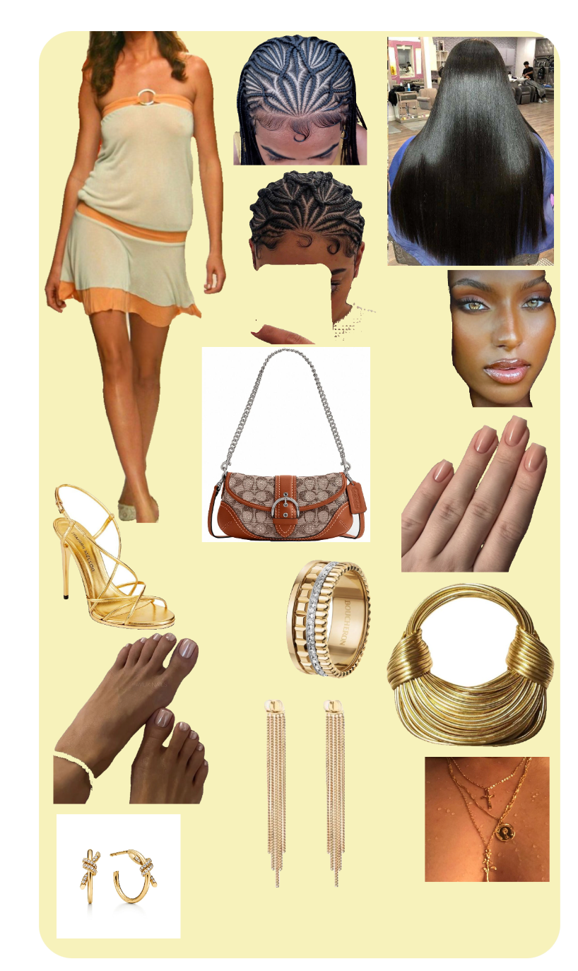 The brown handbag, however, seems slightly out of sync with the rest of the gold-themed accessories. A metallic or neutral-colored bag might have better maintained the outfit's cohesion. The nail polish in a muted nude tone complements the overall natural and understated elegance.