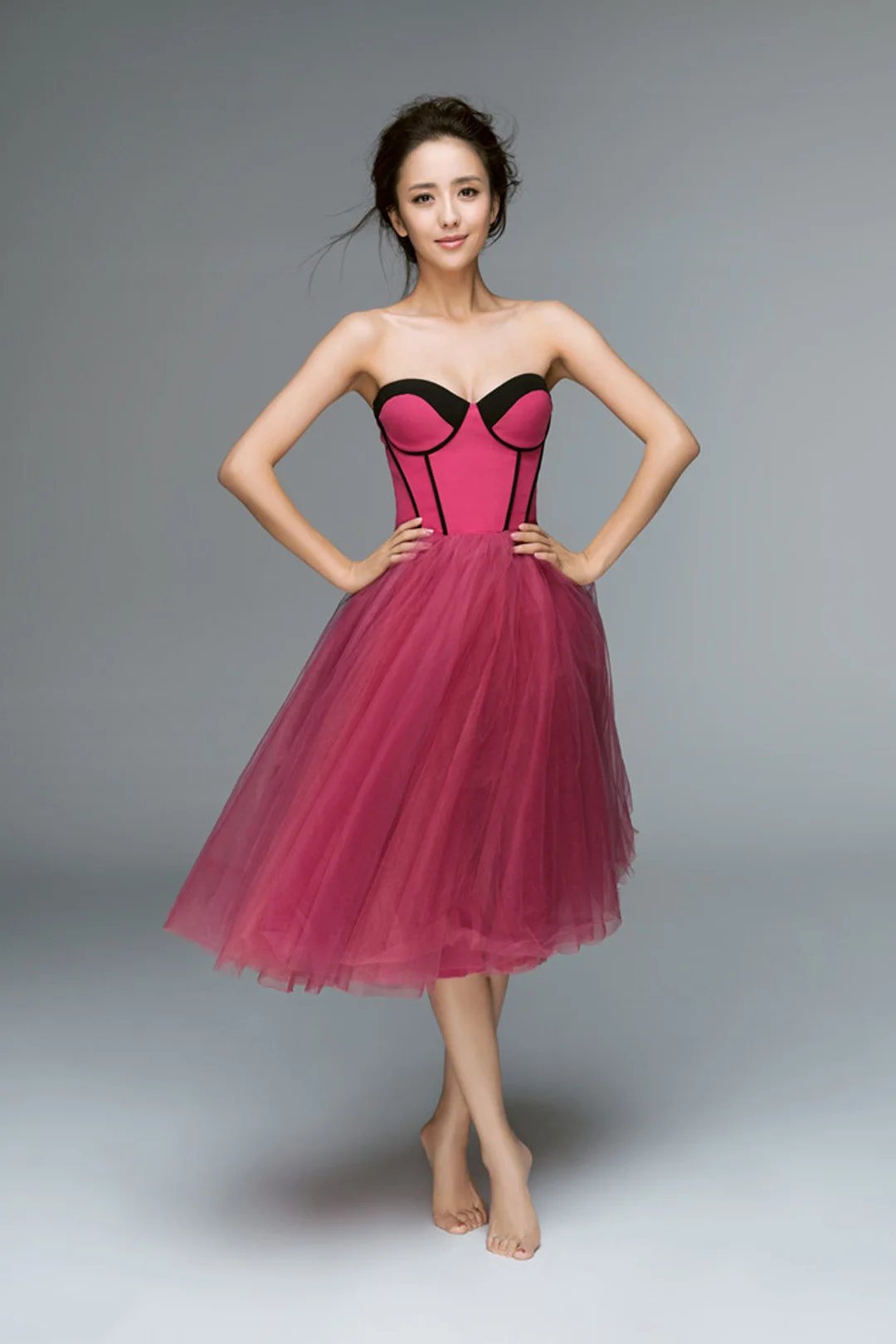 The skirt, made of layers of tulle, gives the dress volume and adds a playful, yet graceful, touch. This balances the structured top, and the knee-length cut makes it versatile for a range of occasions. The choice of going barefoot adds an unexpected, whimsical element to the presentation, but for a complete look, chic heels or sandals could enhance elegance and elongate the legs.