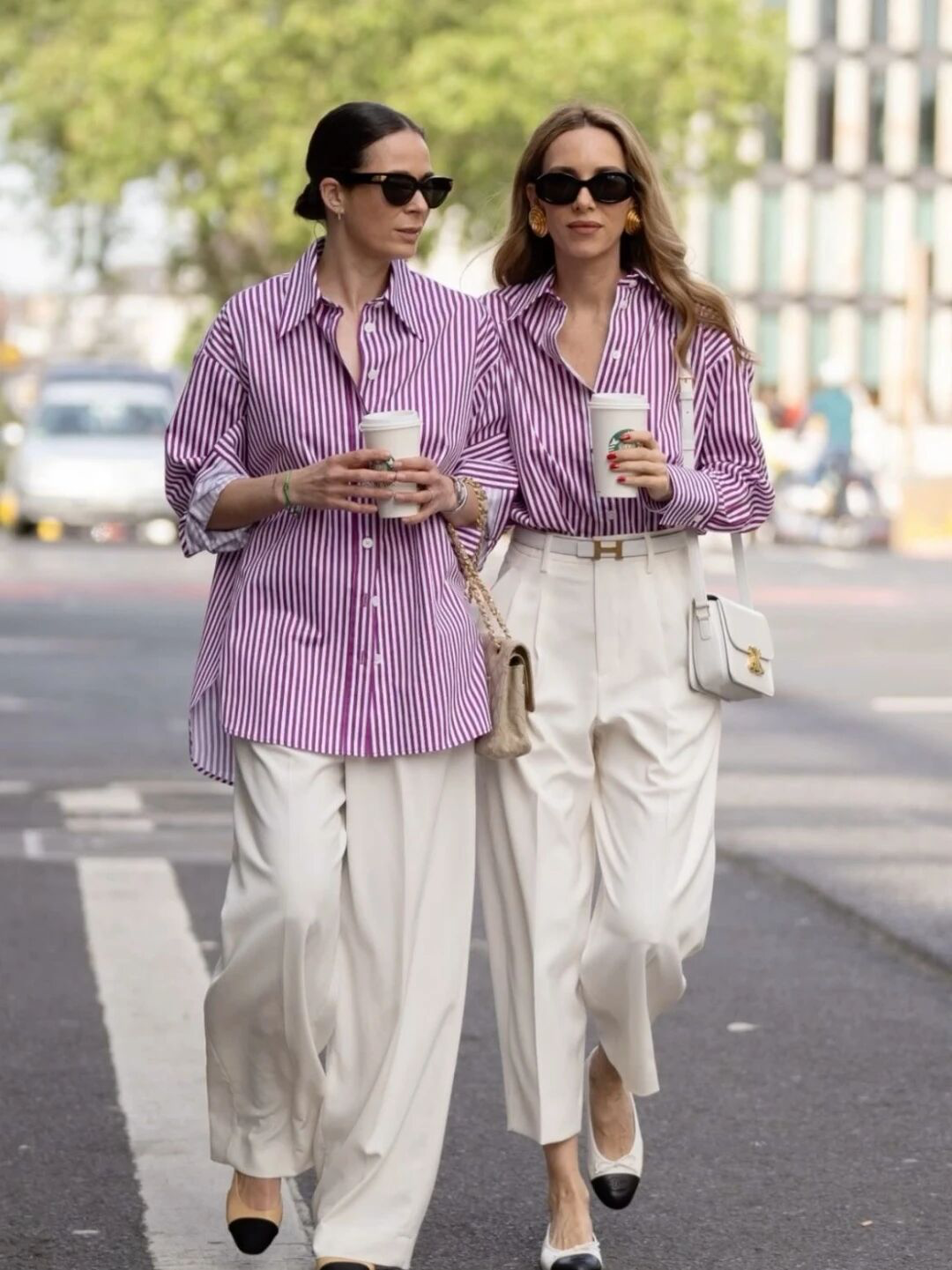 The outfits in the image present a stylish and cohesive look, scoring an 8.5 out of 10. Both individuals wear purple and white striped shirts paired with ivory wide-leg trousers, creating a harmonious and sophisticated ensemble. The shirts are classically designed with a timeless striped pattern that adds an element of visual interest. The choice of purple is both vibrant and refined, complementing the neutral tone of the trousers beautifully.