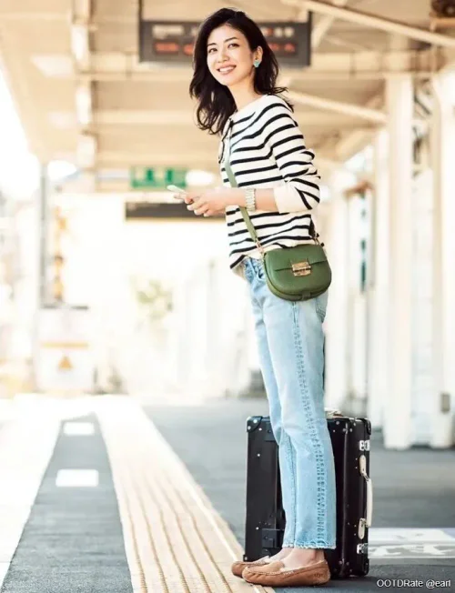The overall silhouette is relaxed yet put together, making it suitable for casual outings, travel, or weekend wear. To enhance the outfit further, consider adding subtle jewelry like a delicate necklace or simple stud earrings to elevate the look. Additionally, a dark belt or a scarf could infuse an extra layer of style and cohesion.