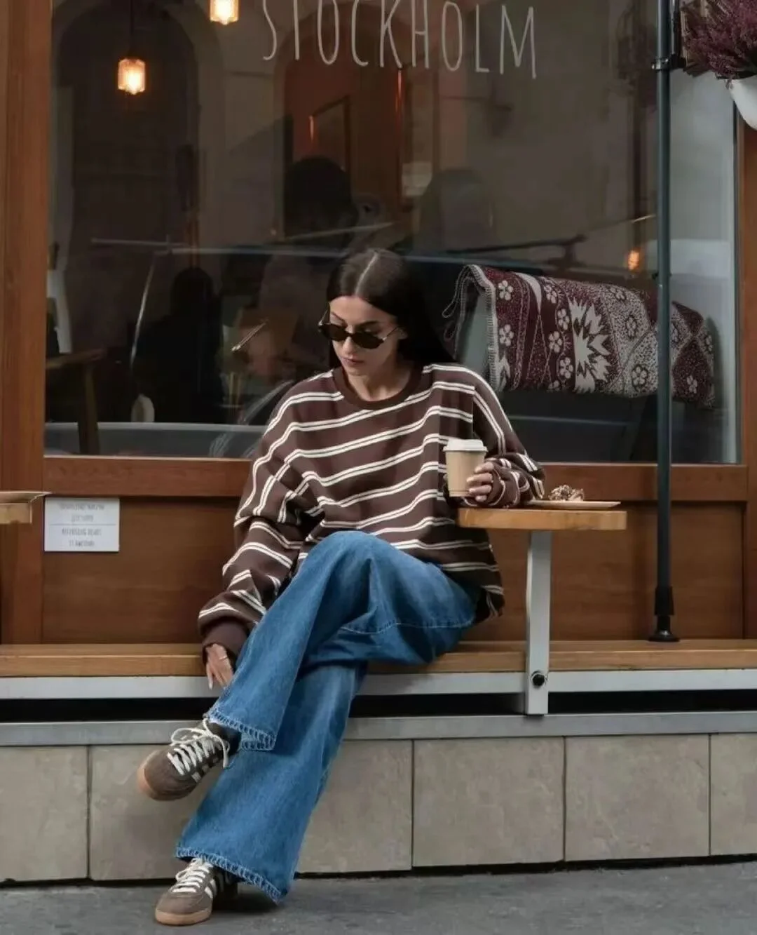 This casual outfit features a brown and white striped oversized sweater paired with wide-legged blue jeans and brown sneakers. The ensemble captures a relaxed, urban vibe that is both stylish and practical, especially for a coffee outing or a day of errands.