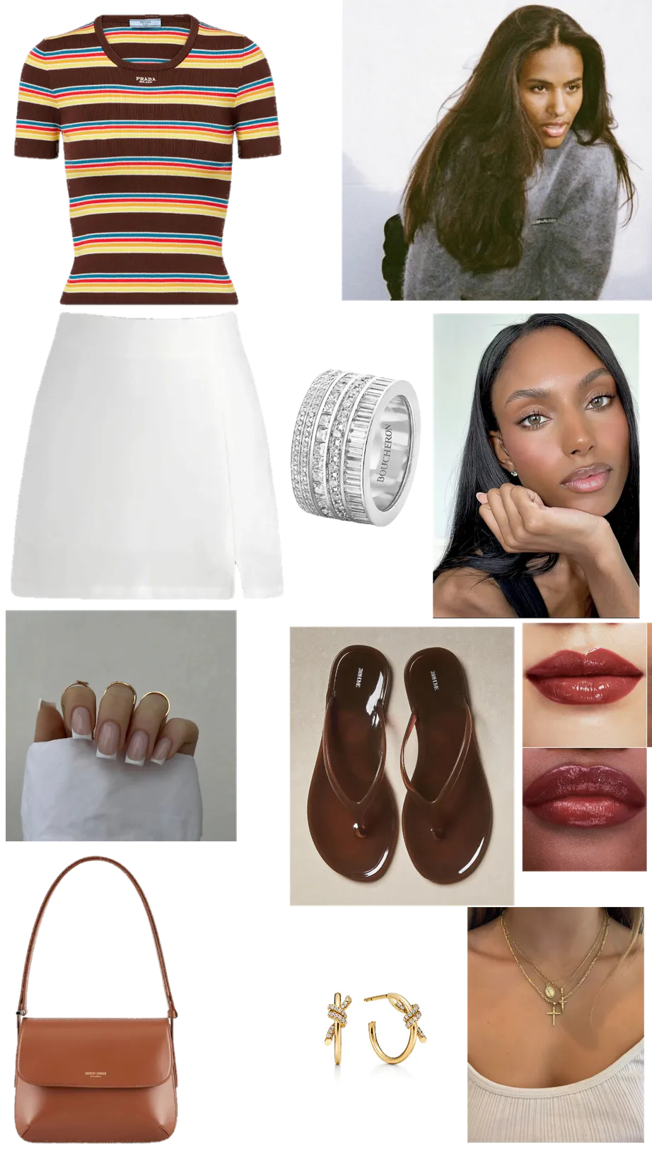 Chic Striped Top and White Skirt with Brown Accessories and Gold Jewelry