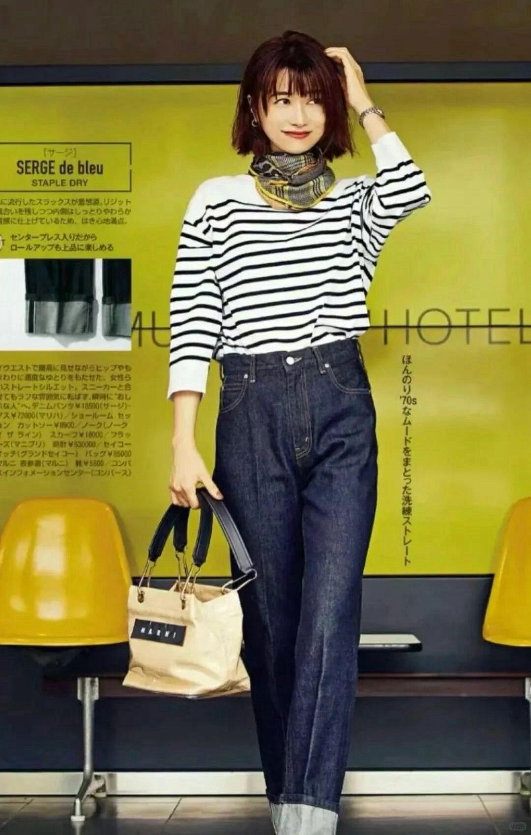 Classic Nautical Striped Top Paired with High-Waisted Cuffed Denim and Chic Accessories
