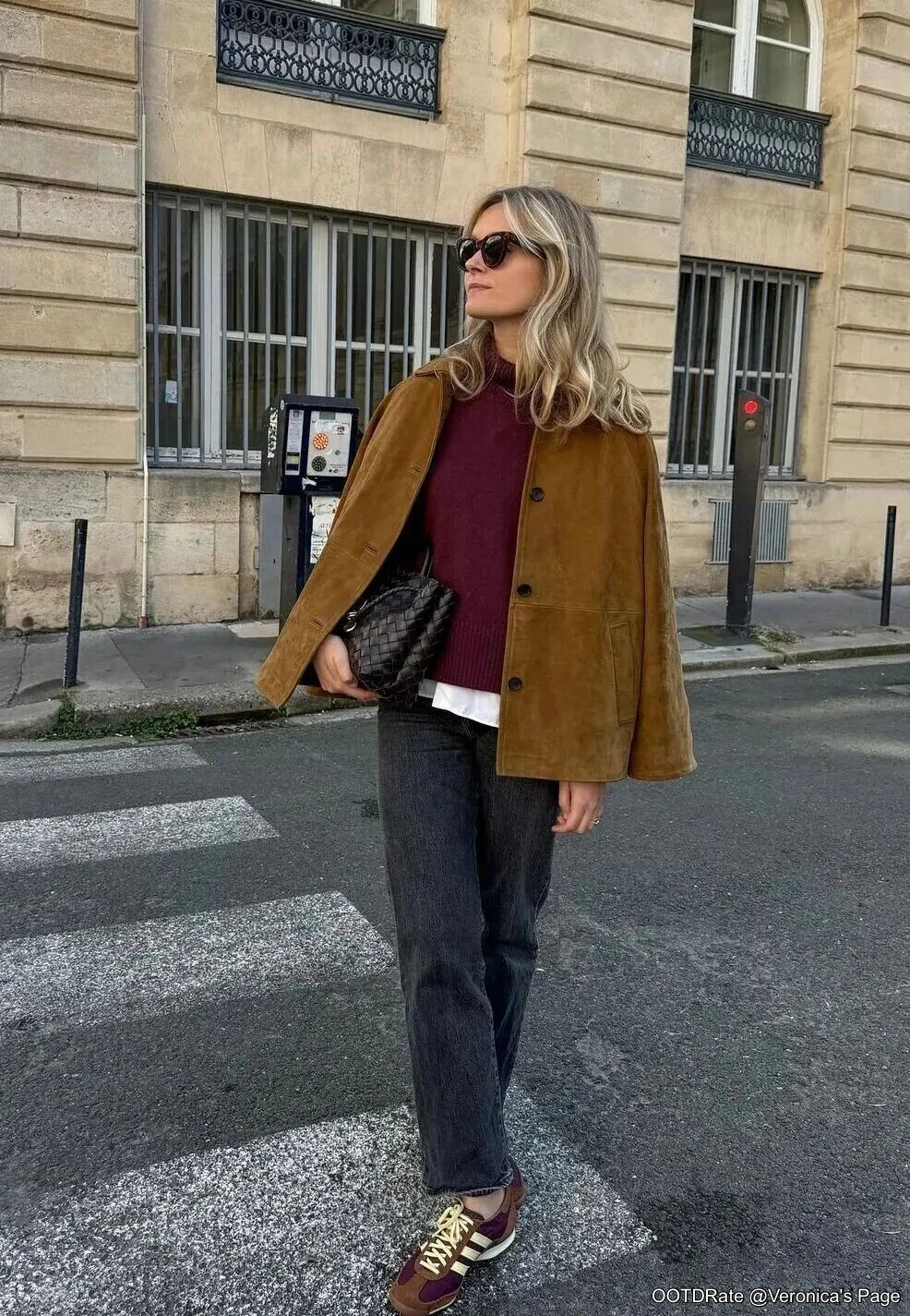 This outfit captures a classic and cozy autumn look with a modern twist. The rich brown suede coat acts as the centerpiece, its earthy tone harmonizing beautifully with the deep burgundy sweater underneath. The use of layers is strategic, with a white blouse subtly peeking out, adding depth and dimension to the ensemble.