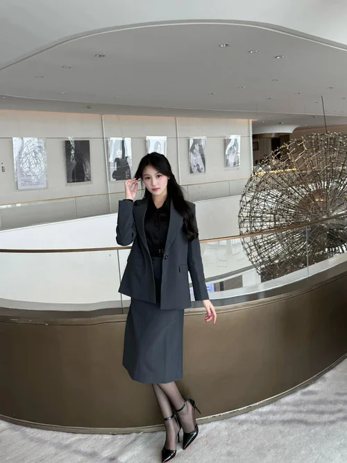 This outfit scores a solid 8.5. The ensemble consists of a dark, tailored suit jacket paired with a matching pencil skirt, exuding a polished and professional aesthetic. The choice of a black, long-sleeve blouse adds a sophisticated depth to the monochromatic color scheme, highlighting a classic yet contemporary style. The fit of the blazer and skirt is impeccable, offering a sharp silhouette that complements the overall look.