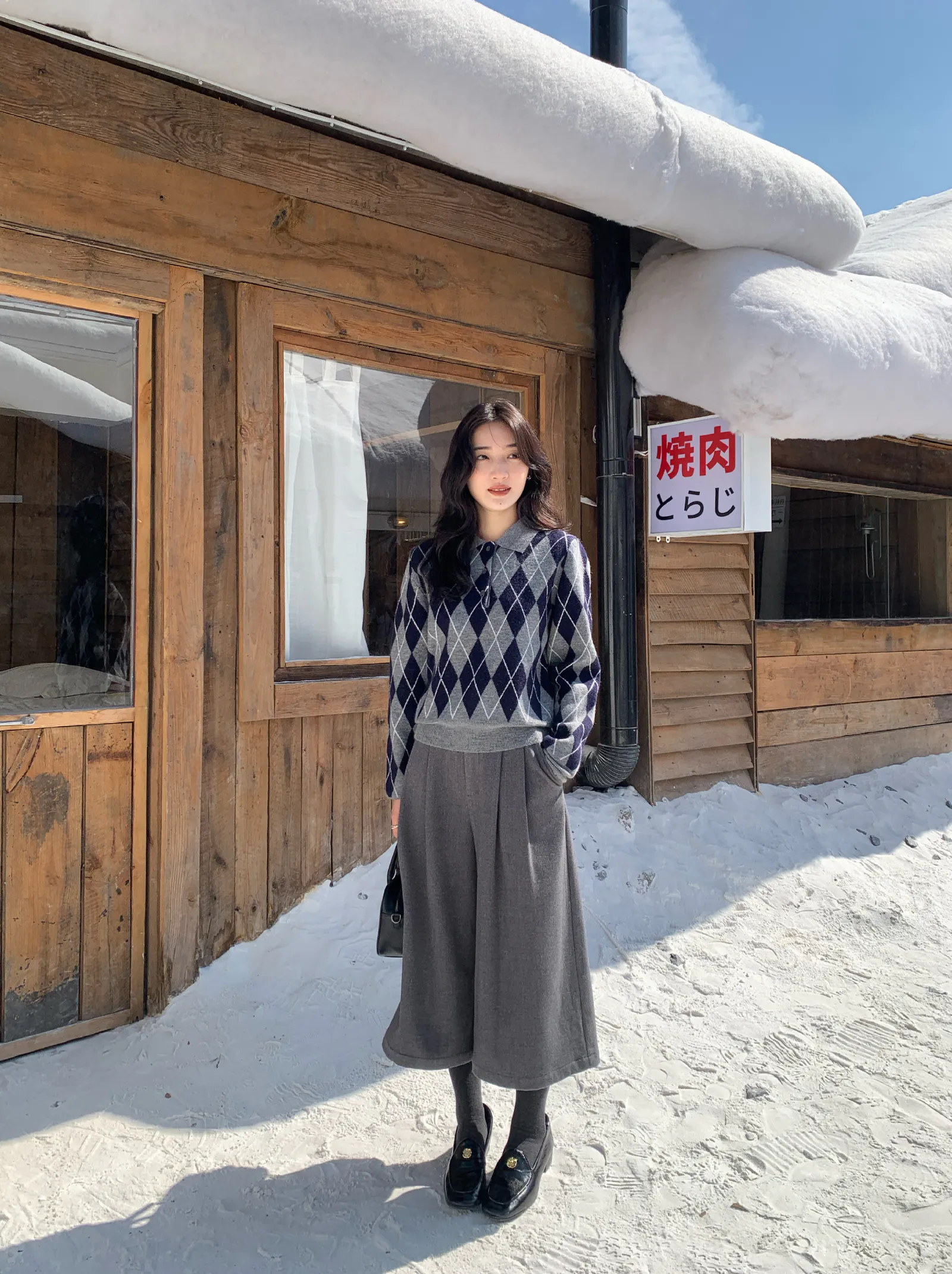 Classic Diamond-Pattern Sweater and Grey Culottes for a Winter Look