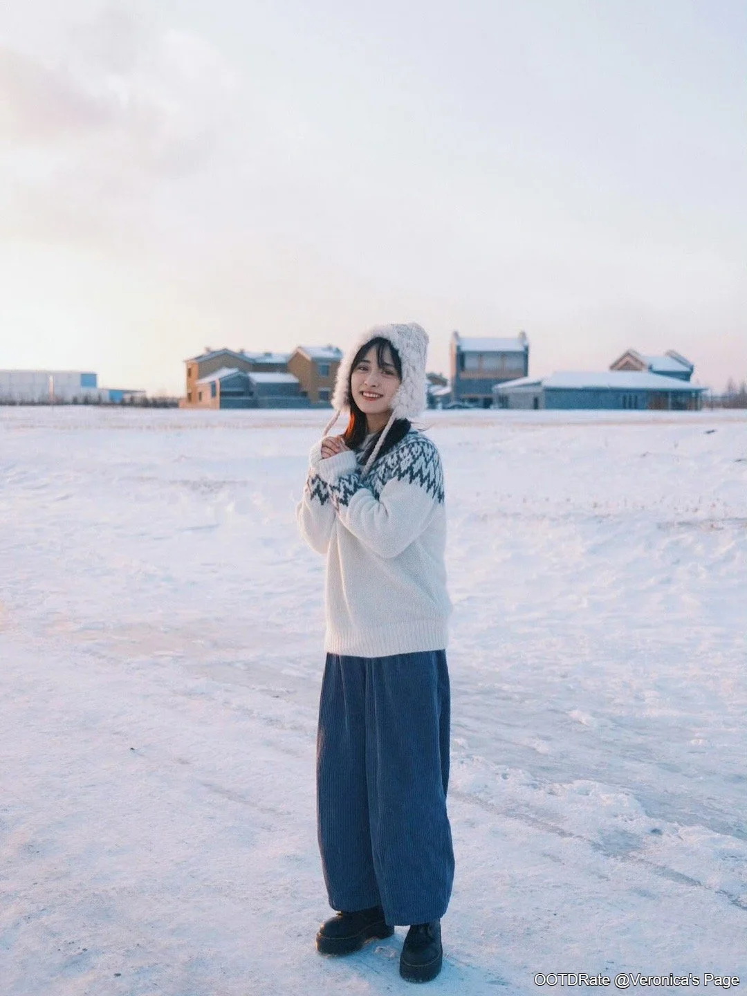 This outfit scores an 8.5. The ensemble creates a cozy, winter-ready look with a strong emphasis on comfort and warmth. The white sweater features an interesting pattern along the shoulders and neck, adding a touch of visual interest and texture to the outfit. Its slightly oversized fit enhances the relaxed, comfortable vibe ideal for a cold setting.