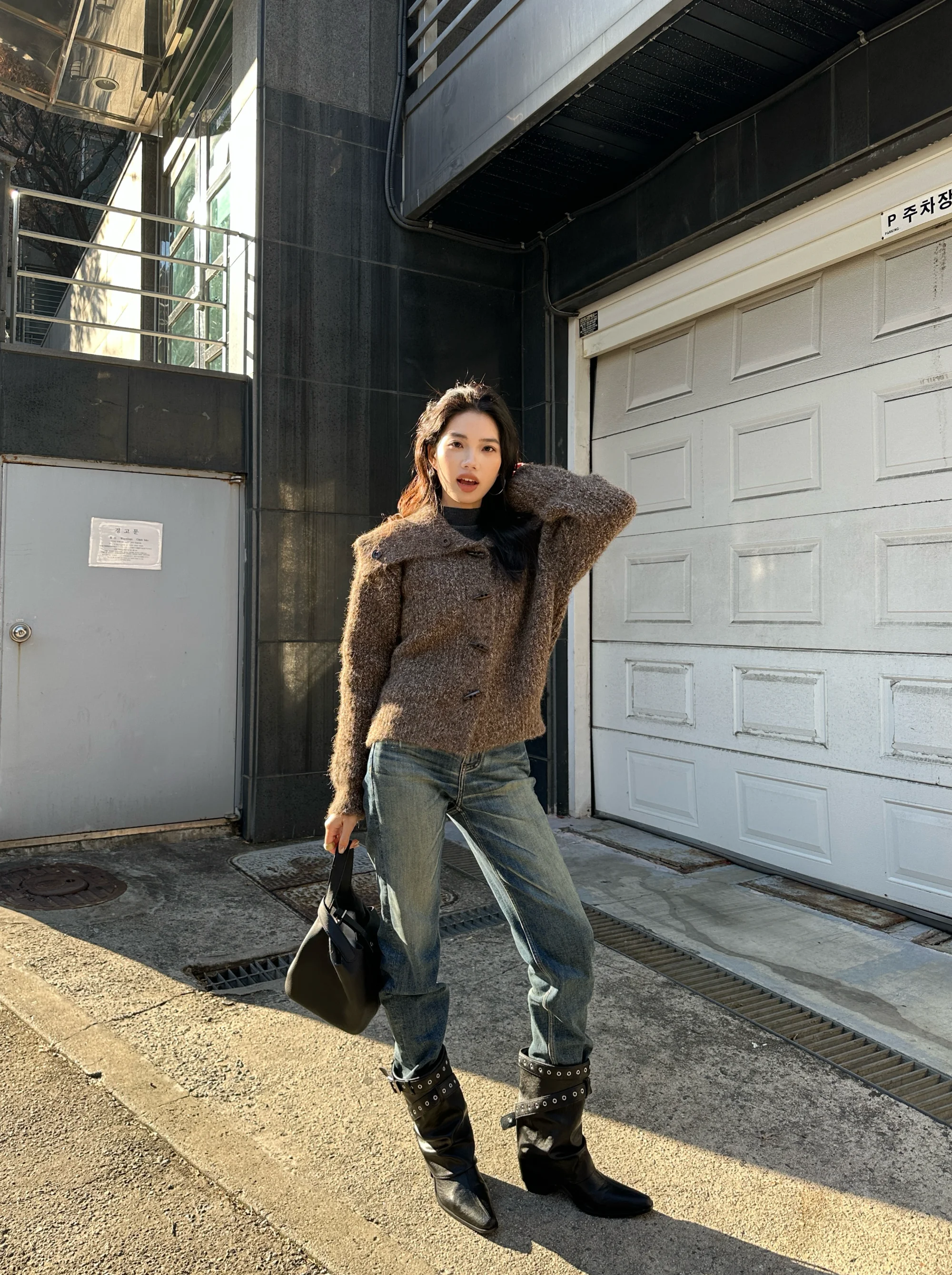 This outfit combines casual and edgy elements, creating a laid-back yet stylish look. The chunky, textured brown sweater provides a cozy and warm feel, perfect for colder months. Its relaxed fit pairs nicely with the slightly distressed jeans, adding an element of ruggedness to the ensemble. The color harmony between the brown sweater and the blue jeans creates a pleasing contrast, offering a balanced and cohesive look.