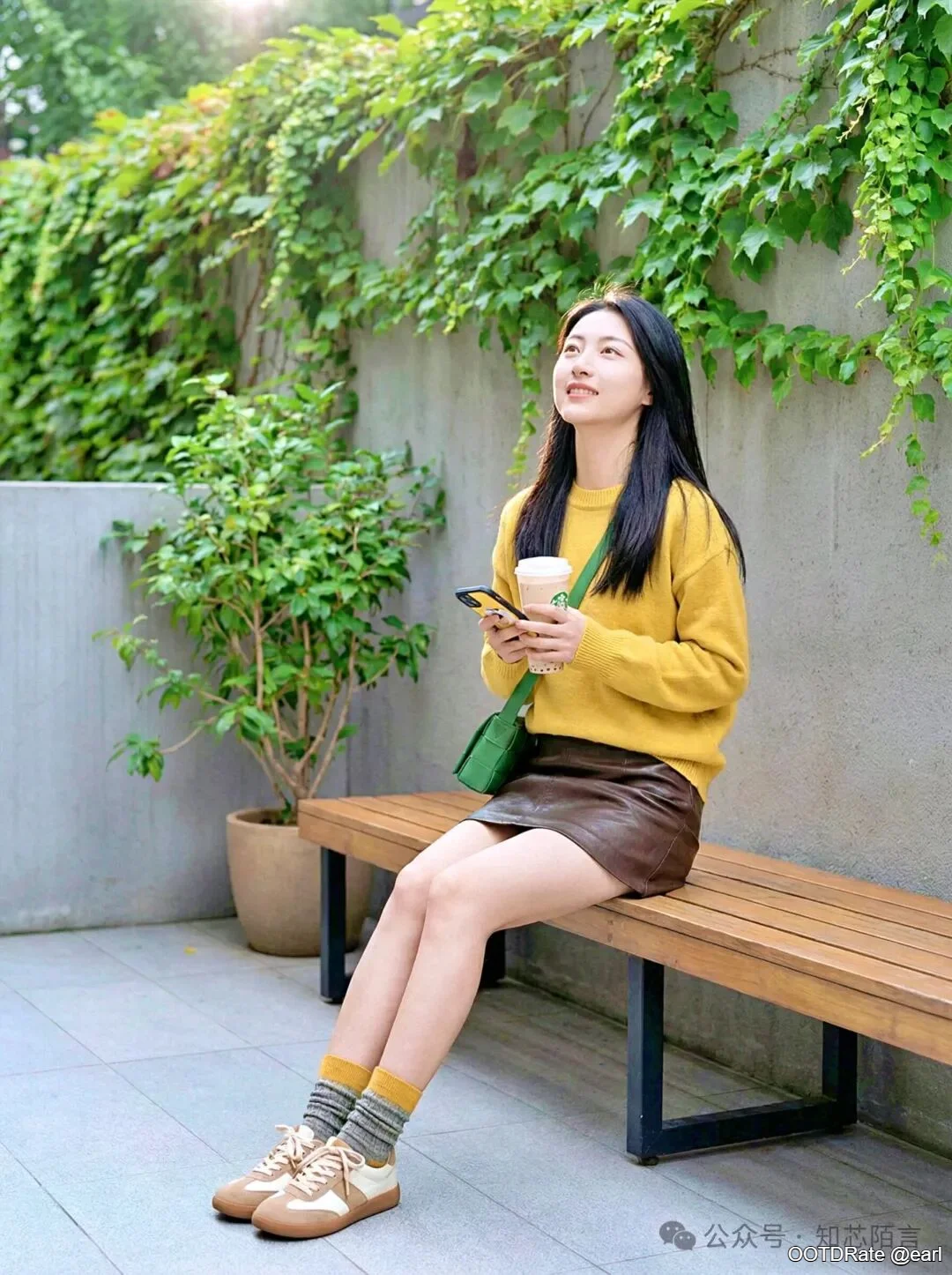 Casual Chic: Mustard Sweater and Brown Leather Skirt with Sneakers