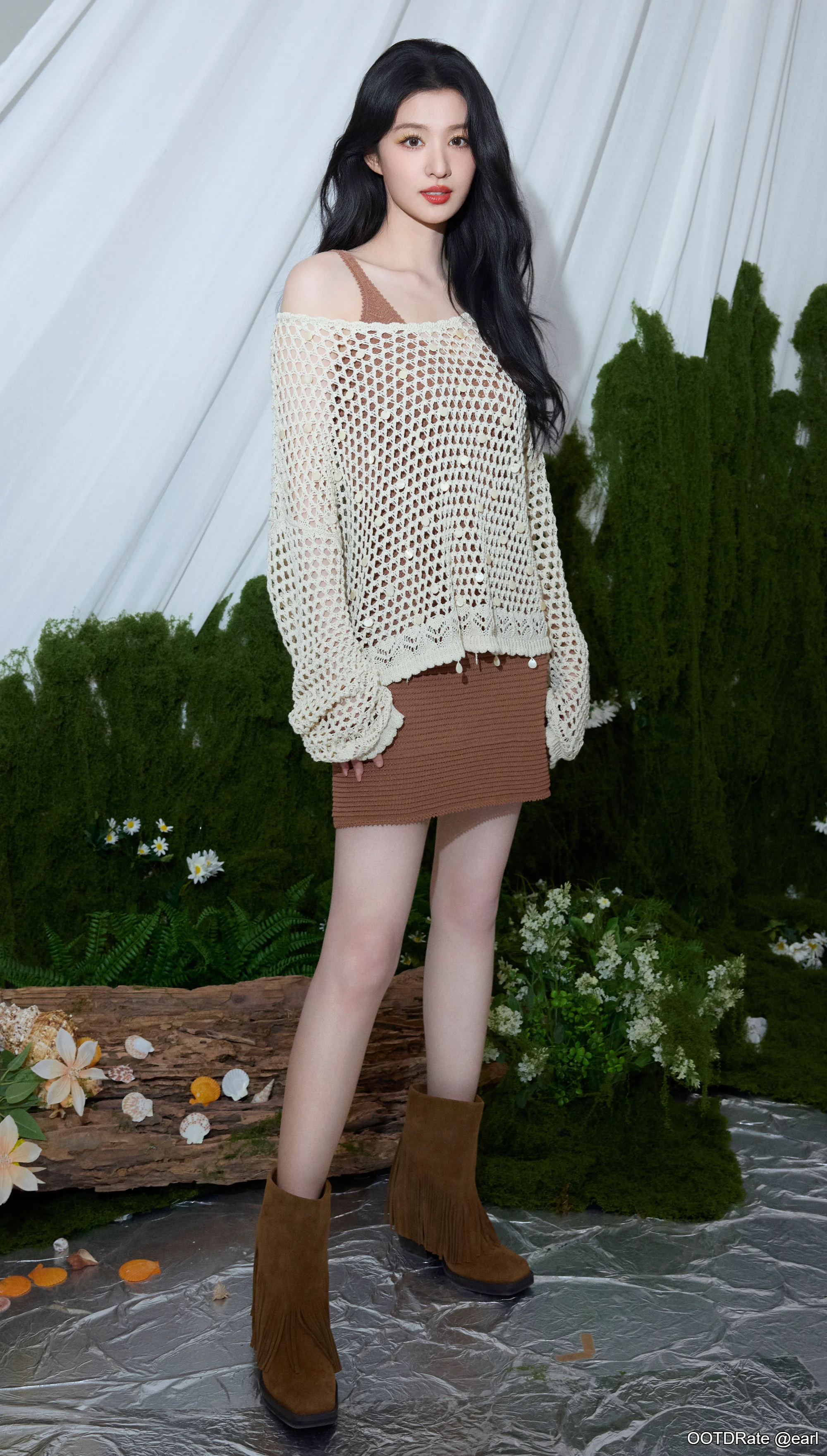 This outfit receives a score of 8.5. The combination of a loose, off-the-shoulder knit sweater over a fitted brown mini dress creates a balanced contrast between casual and chic. The oversized sweater adds a relaxed, bohemian flair, perfectly complemented by the fringe detailing on the ankle boots. The brown dress is an excellent choice, providing a neutral base and adding warmth to the look, which is echoed in the earthy tones of the boots.