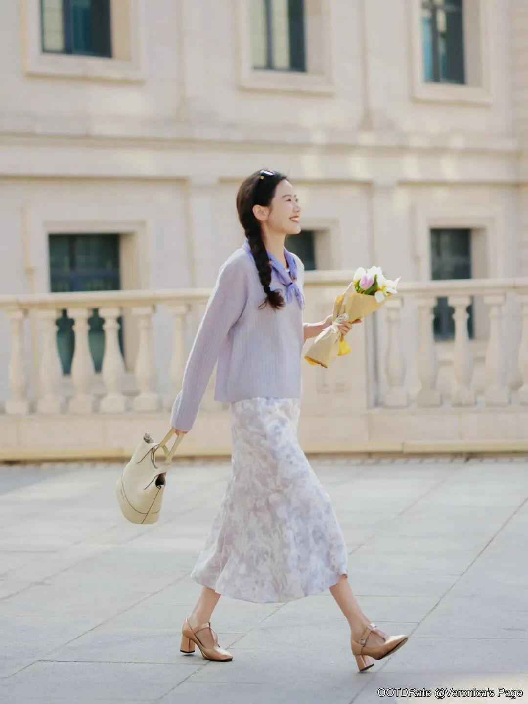 This outfit scores an 8.5 out of 10. The ensemble presents a harmonious blend of soft colors and elegant style. The lilac sweater with its oversized fit offers a cozy yet chic vibe, adding a gentle pop of color to the look. Paired with the white floral midi skirt, the outfit maintains a feminine and sophisticated edge, perfect for a spring or early autumn outing.