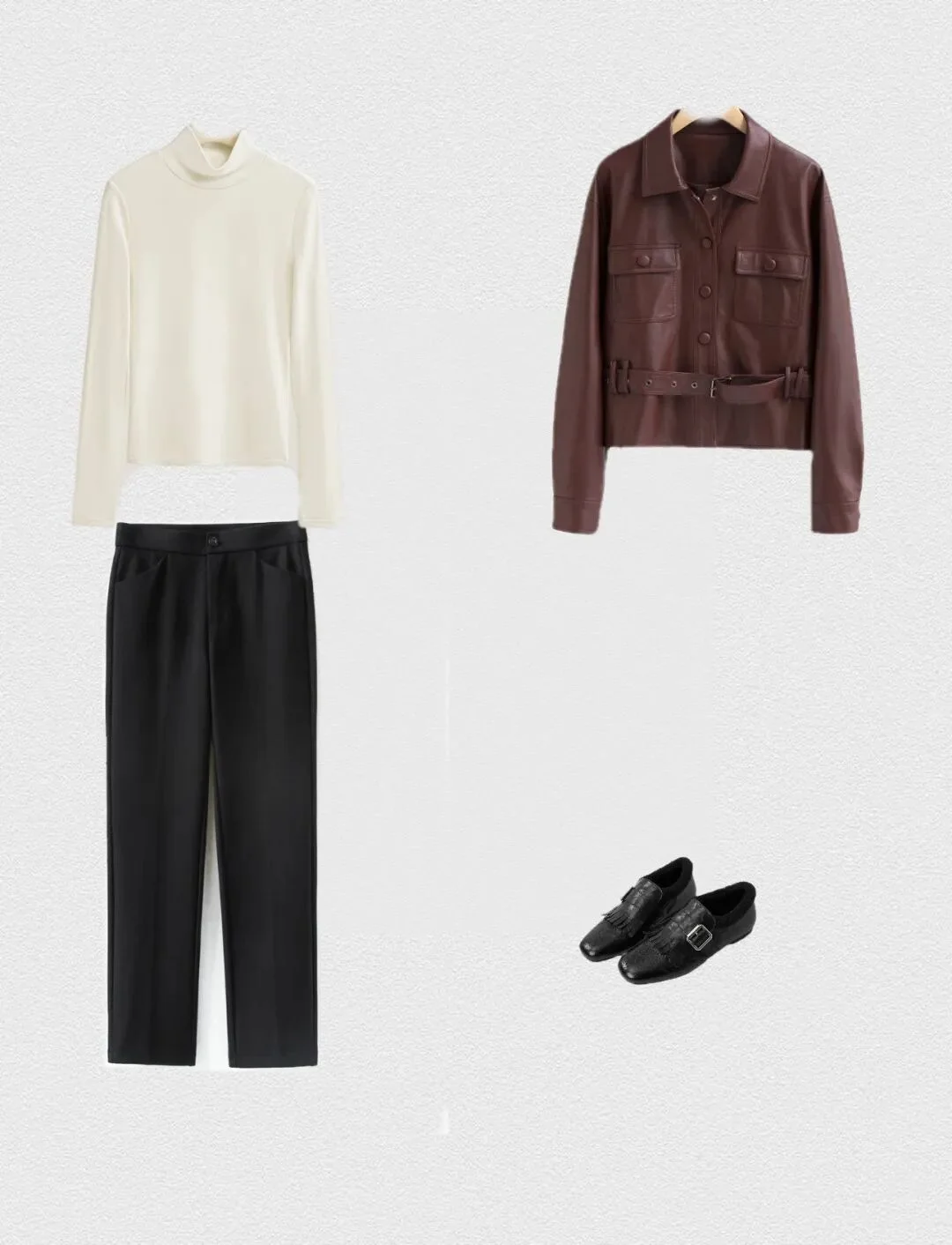 The brown jacket adds a layer of richness and depth, with a structured design that complements the turtleneck and trousers. The belted waist of the jacket introduces a tailored touch, enhancing the outfit's shape and adding sophistication. It also contributes a warm, earthy color, creating a pleasing color palette that harmonizes with the cream and black.