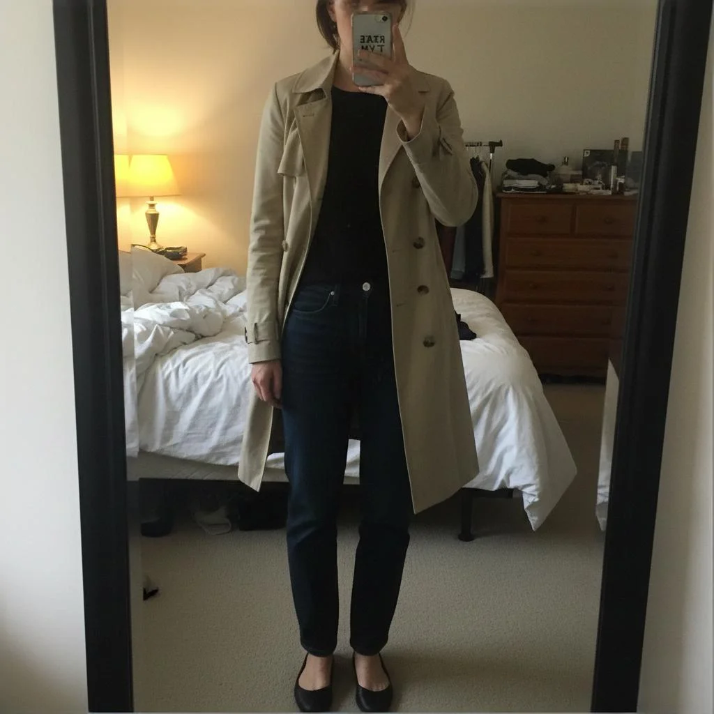 The color palette—neutral beige with black—works effortlessly together, ensuring a versatile and polished appearance. However, adding an accessory like a scarf or a statement necklace could enhance the outfit further by introducing texture and a hint of color. Additionally, rolling up the trench coat sleeves slightly might add a casual vibe that complements the overall style without losing sophistication.