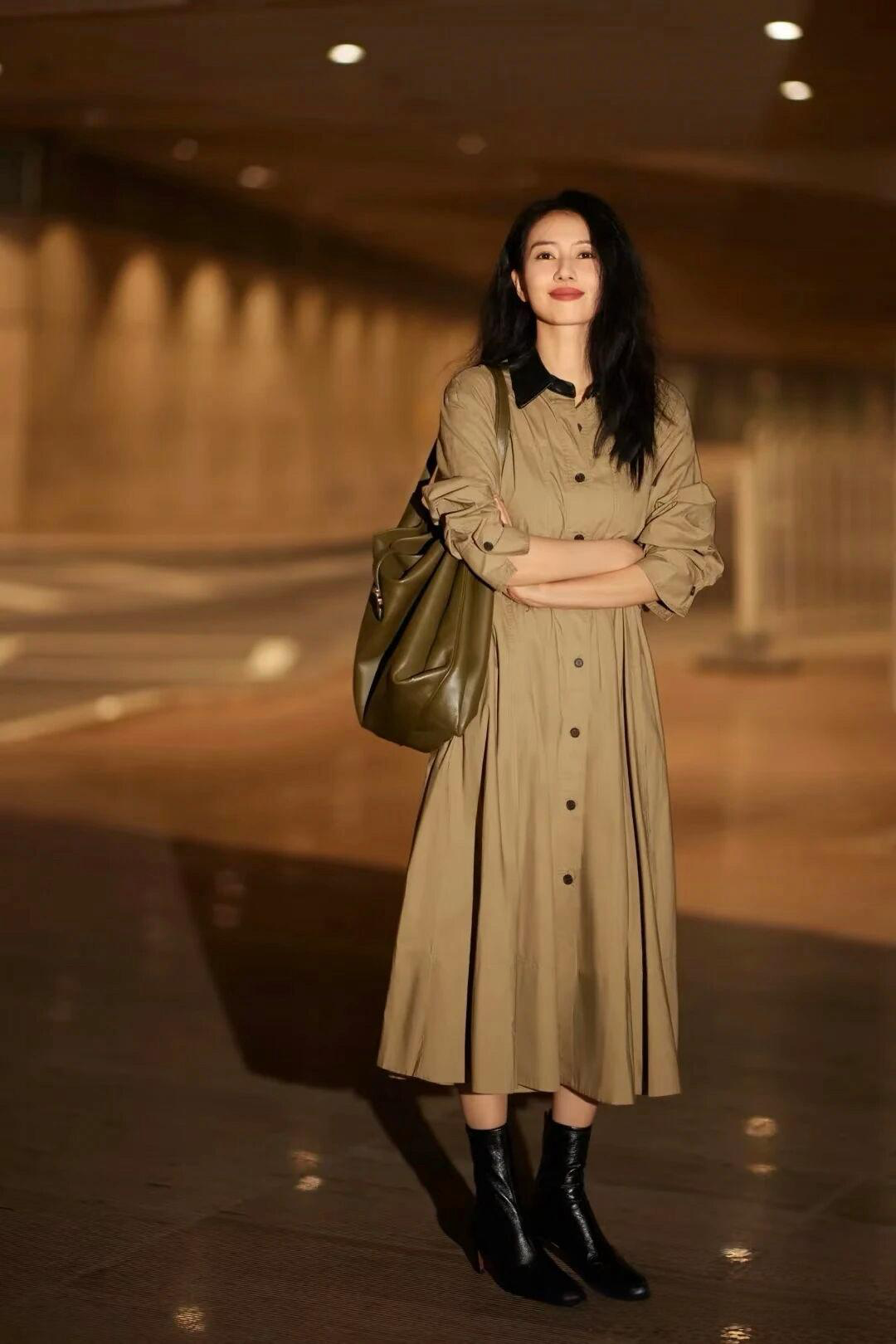 This outfit showcases an elegant mix of classic and modern elements. The focal point is a stylish, buttoned-up, beige trench dress that reaches mid-calf, embodying a blend of sophistication and casual ease. The black collar offers an excellent contrast, elevating the entire look and adding a touch of formality. The fit is loose, but structured enough to maintain a flattering silhouette.