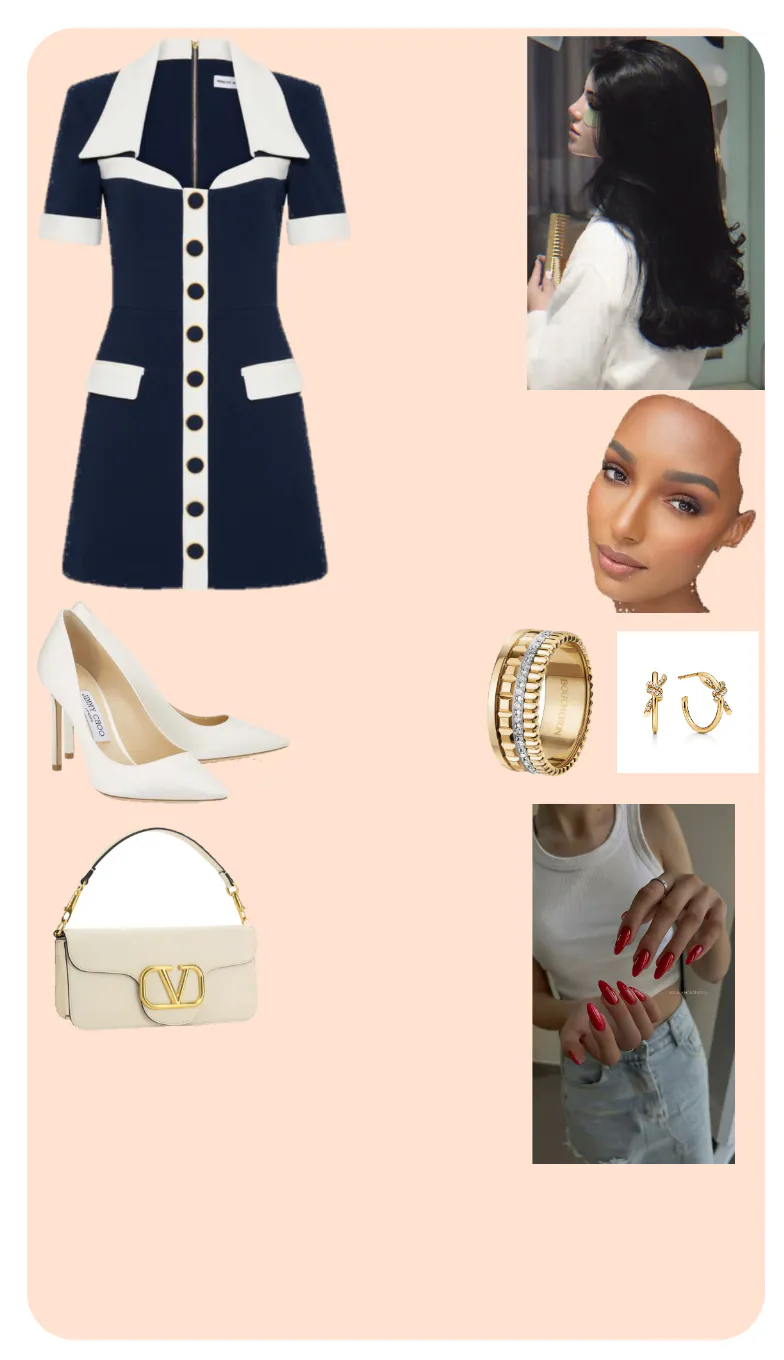 This outfit presents a polished and chic aesthetic with a touch of vintage flair. The navy dress with white accents is a classic choice, offering a sophisticated and timeless appeal. The button detailing adds a touch of elegance, enhancing the dress's retro vibe. The crisp white collar and cuffs are a nice contrast against the deep navy, providing a refreshing look.