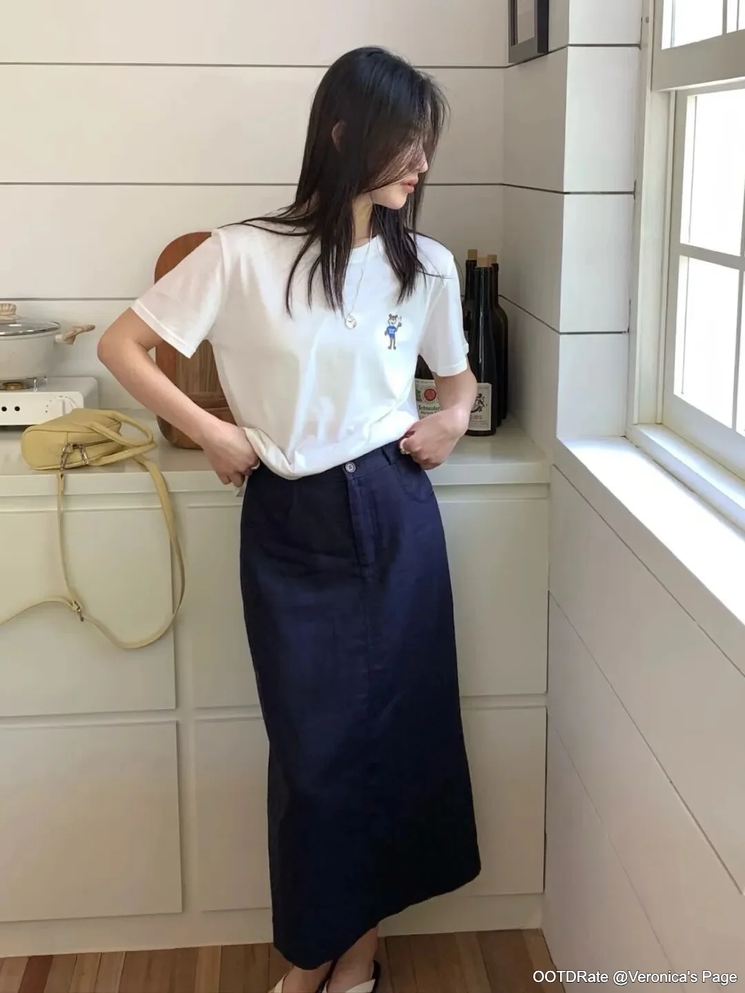 The choice of colors is spot on; the contrast between the crisp white tee and the deep blue skirt provides an appealing visual interest without being overwhelming. Each piece complements the other, making the outfit appear cohesive and stylish. The long skirt helps elongate the figure, and the way the T-shirt is partially tucked in adds a casual sophistication.