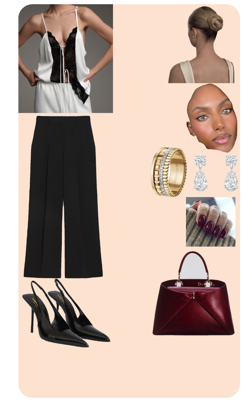 The accessories elevate the outfit further, with the diamond drop earrings and gold ring adding a luxe feel. The black pointed-toe heels are a versatile choice, complementing the pants and ensuring the whole outfit maintains a sleek line. The burgundy handbag introduces a pop of color, which enhances the look by adding warmth and depth, contrasting nicely with the monochromatic clothing.