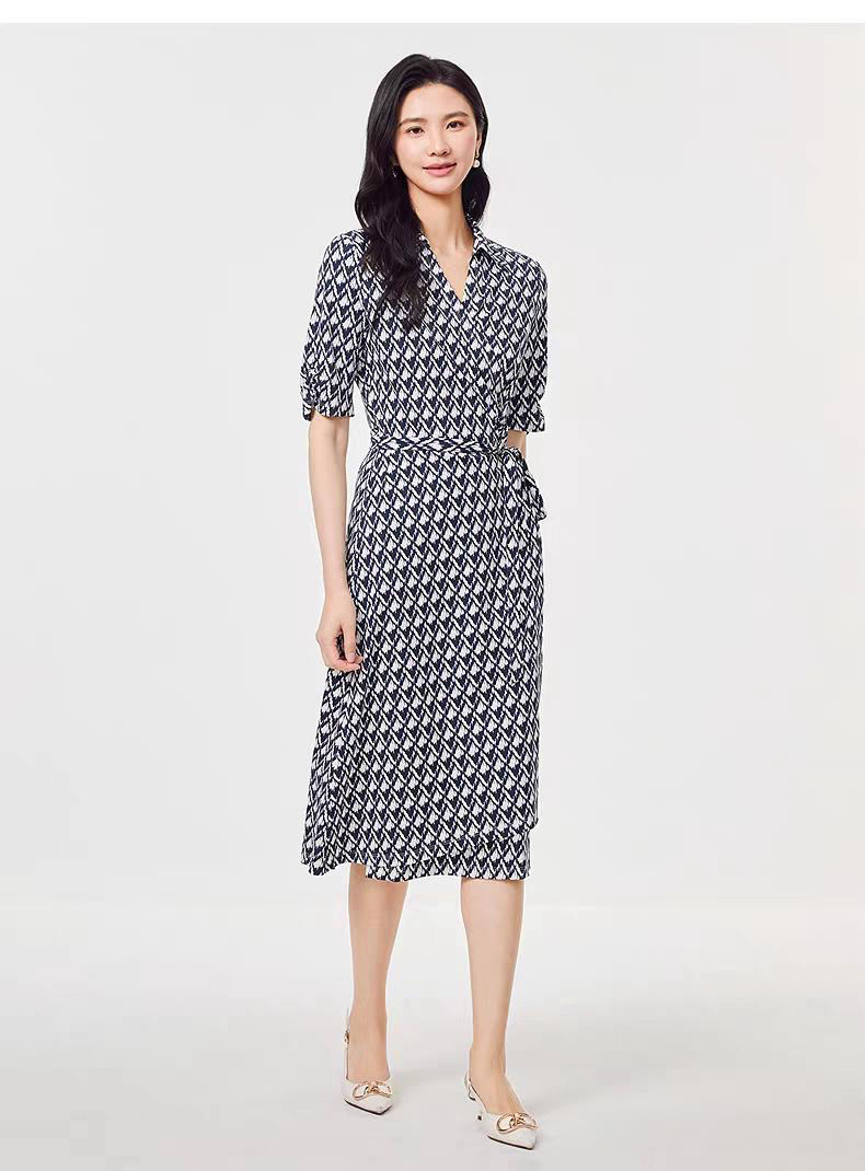 Classic Black and White Geometric Wrap Dress with Elegant Silhouette