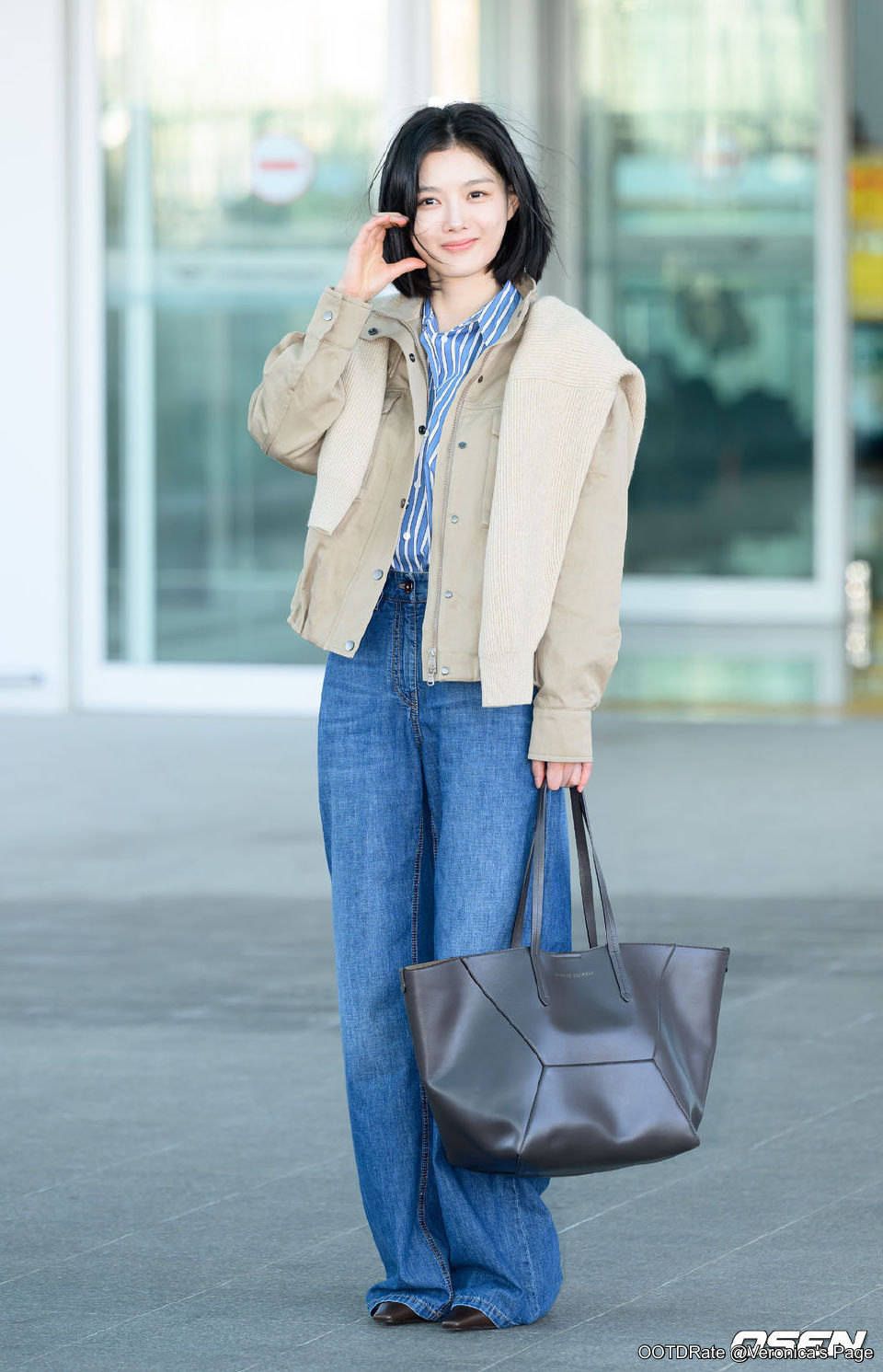This outfit blends casual and chic elements effectively. The blue and white striped shirt brings a classic touch, harmonizing well with the loose-fitting blue jeans, which offer a laid-back vibe. The beige jacket provides a subtle contrast, adding warmth and depth to the color palette. Draping the knit sweater over the shoulders is a stylish twist that infuses a preppy feel, doubling as a functional addition for fluctuating temperatures.