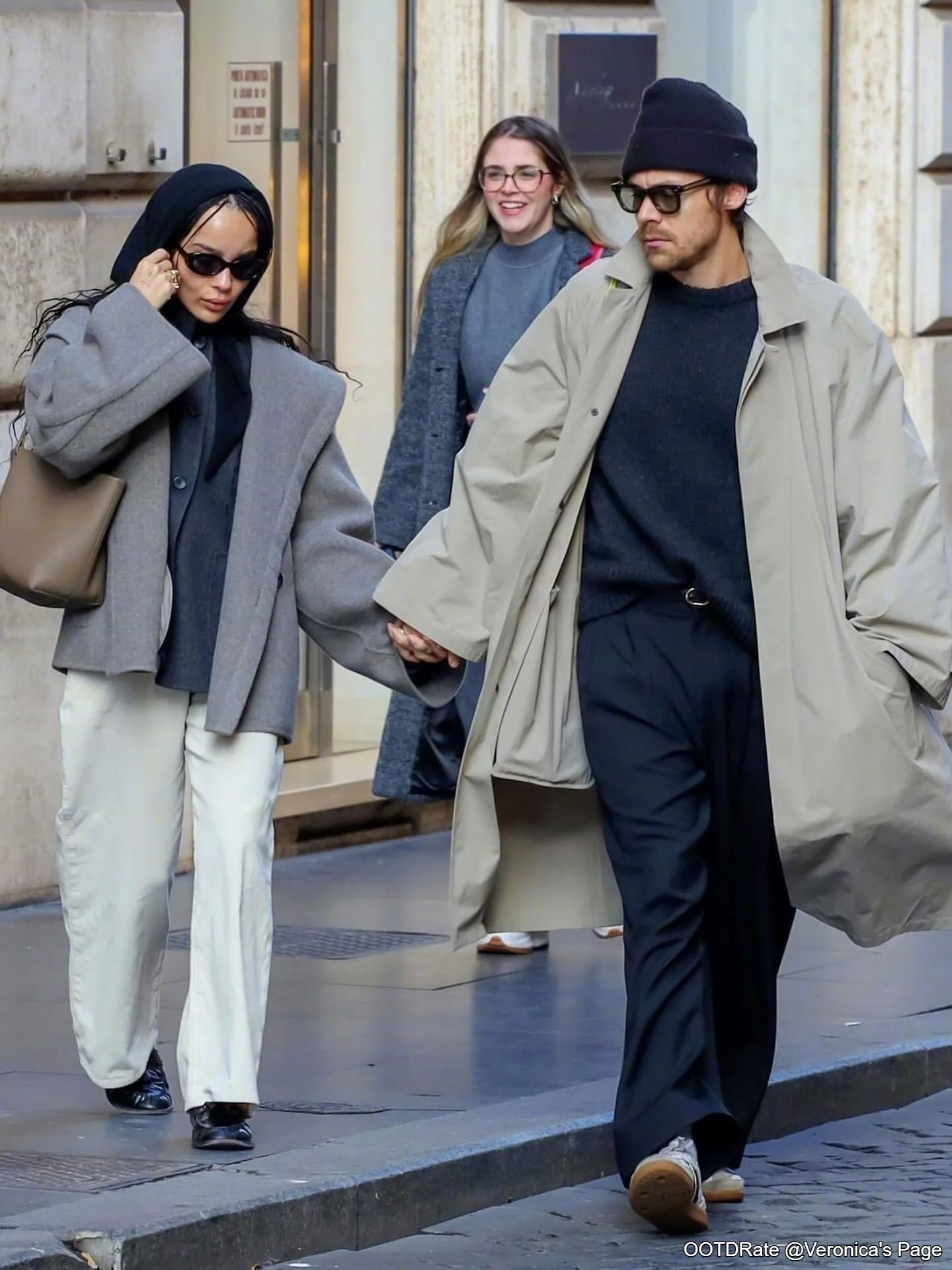 The person on the right sports a long, oversized coat in a neutral tone over a black sweater and dark trousers. This combination is effortlessly stylish, with the coat serving as a standout piece. The black beanie and sunglasses amplify the cool, street-style vibe. The muted color scheme throughout both outfits creates harmony between the two individuals while still allowing each to retain unique style elements.