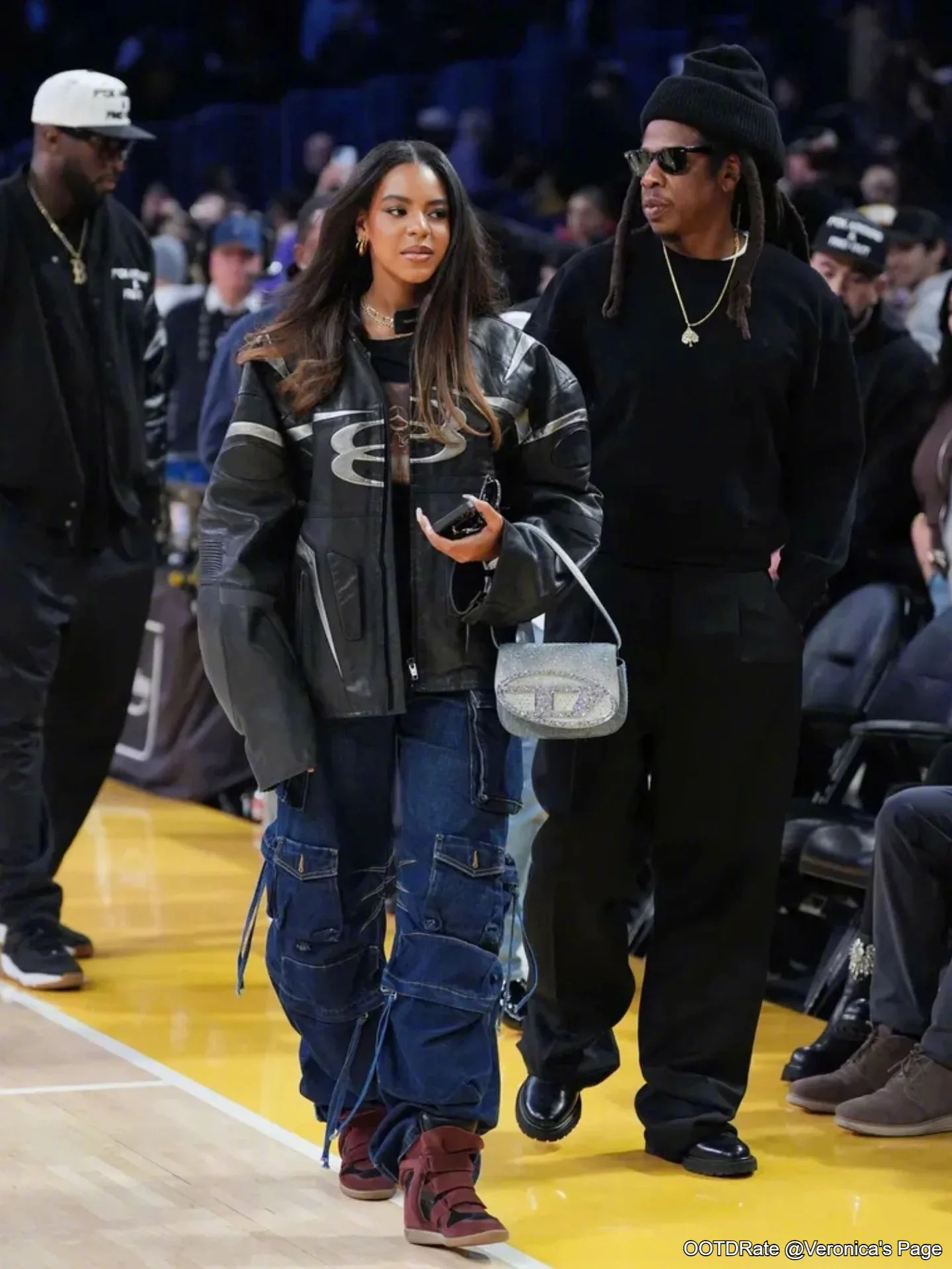 The red high-top sneakers contribute a surprising pop of color, injecting an element of vibrancy and playfulness into the otherwise dark palette. The metallic handbag is a striking accessory choice, adding a touch of shine that balances the outfit's rugged elements with a hint of glam.