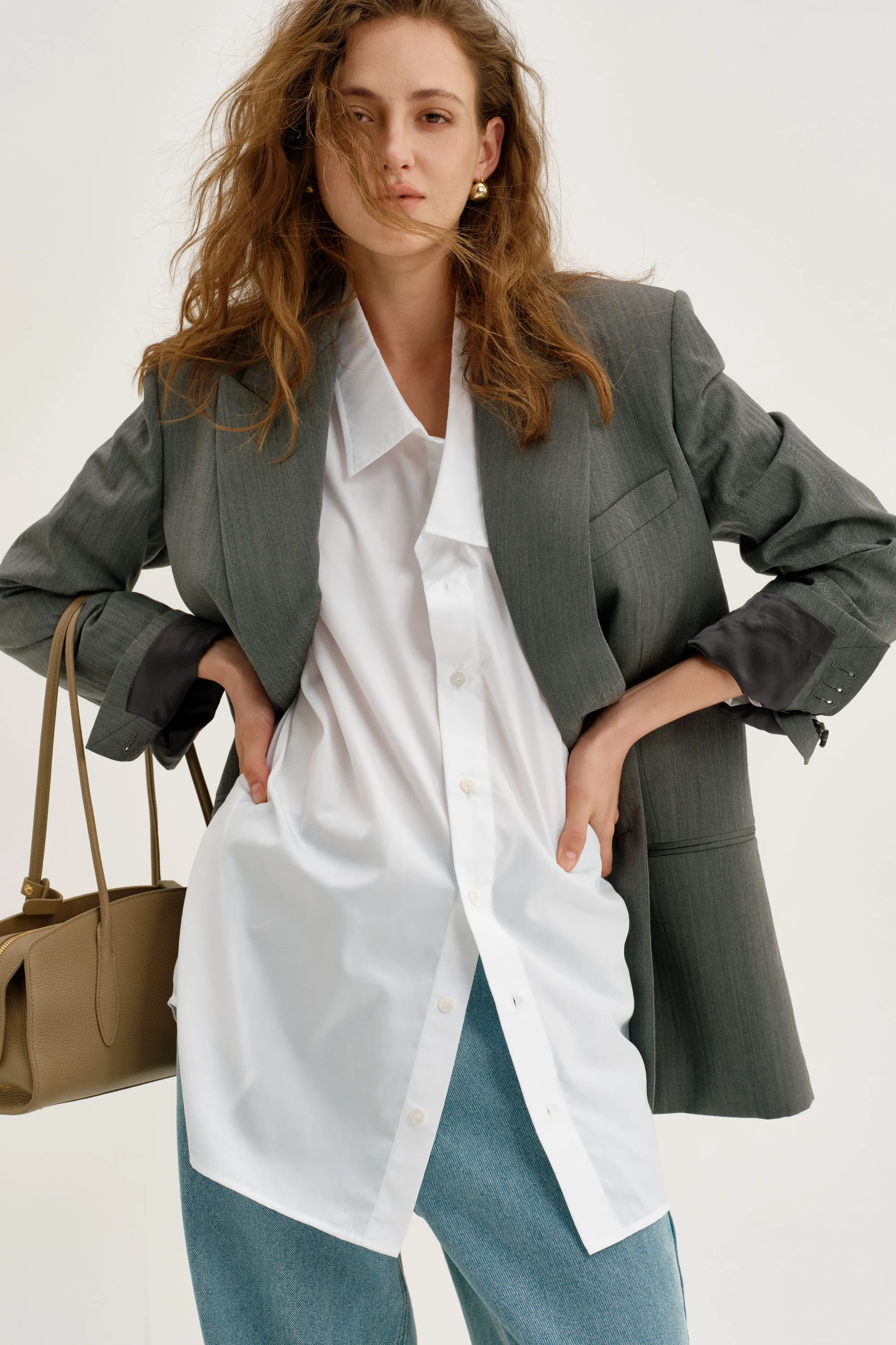 This outfit combines classic menswear-inspired elements with a modern twist, achieving a stylish and sophisticated look. The oversized gray blazer adds a sharp, tailored edge, harmonizing well with the crisp white button-down shirt, which is worn untucked for a relaxed vibe. The contrast between the structured blazer and the soft, casual shirt creates an appealing dynamic that is both professional yet approachable. The addition of light blue denim brings a laid-back touch, making the outfit versatile for both business casual settings and more casual environments.