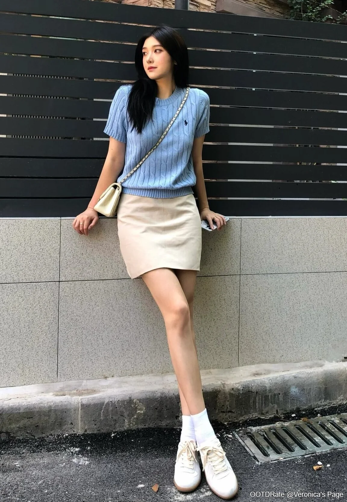 Paired with a beige miniskirt, the outfit maintains a clean and chic aesthetic. The skirt's simple cut and neutral color seamlessly complement the sweater, ensuring that the look remains cohesive and balanced. The length of the skirt is well-chosen, striking a perfect balance between trendy and appropriate for various occasions.