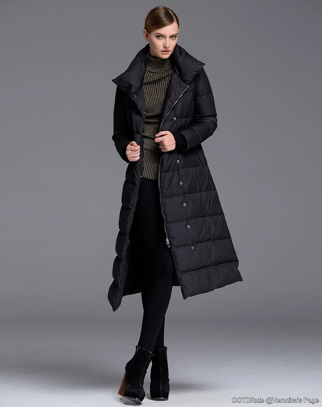 This outfit is well-suited for colder climates and offers a stylish combination of warmth and elegance. The long black padded coat dominates the ensemble, providing a sleek and structured look that is highly functional. Its glossy finish adds a touch of sophistication, making it versatile enough for both casual and more formal winter occasions. The coat's length and straight silhouette enhance the overall streamlined appearance, which is complemented by the choice of black leggings underneath.