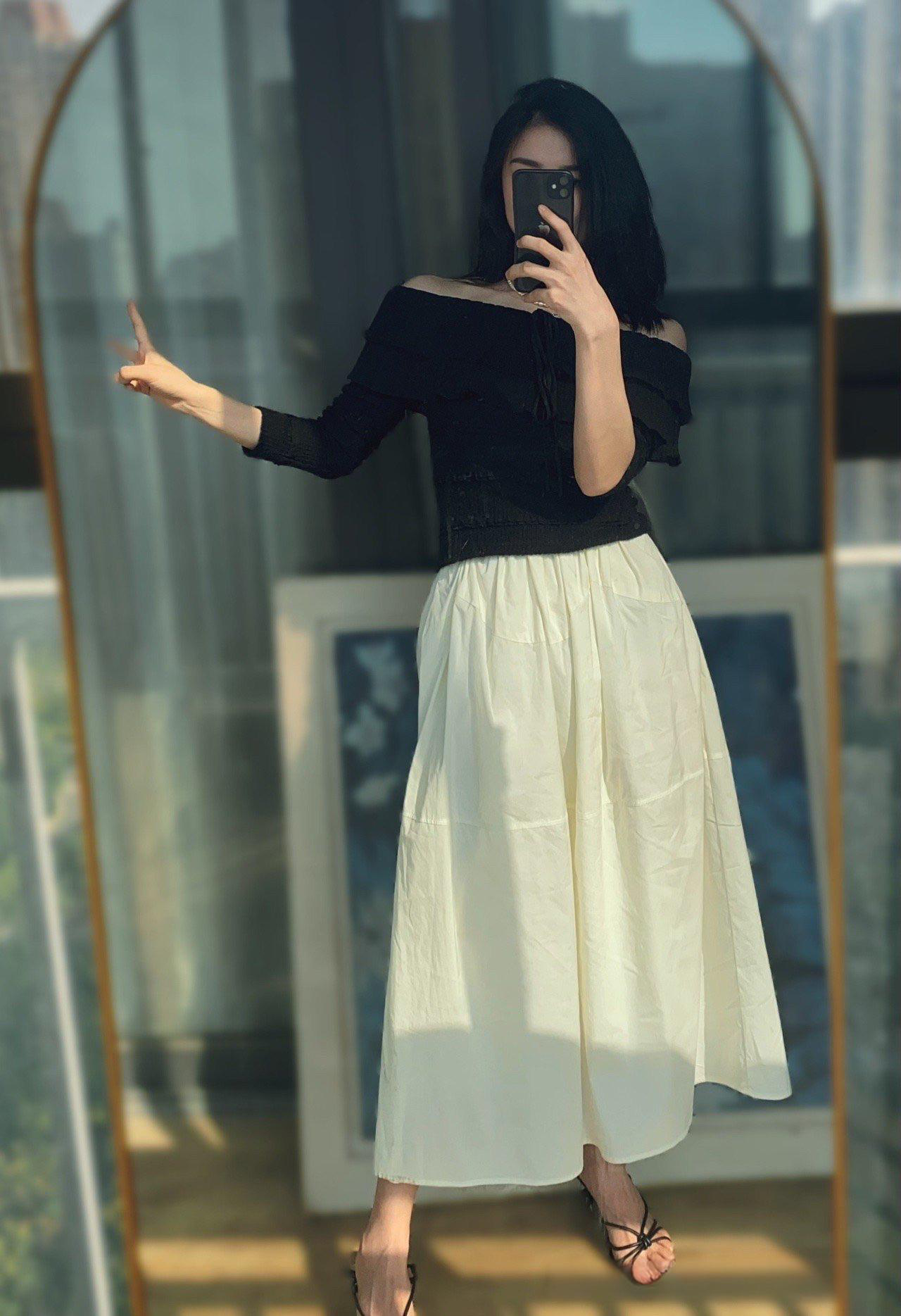 This outfit scores a strong 8.7 out of 10. The ensemble showcases a sophisticated balance between simplicity and elegance. The off-the-shoulder black top introduces a touch of allure, creating a sleek silhouette while emphasizing the neckline and shoulders. This choice pairs wonderfully with the high-waisted, A-line white skirt, which falls gracefully to mid-calf, adding a soft, feminine contrast to the darker top.