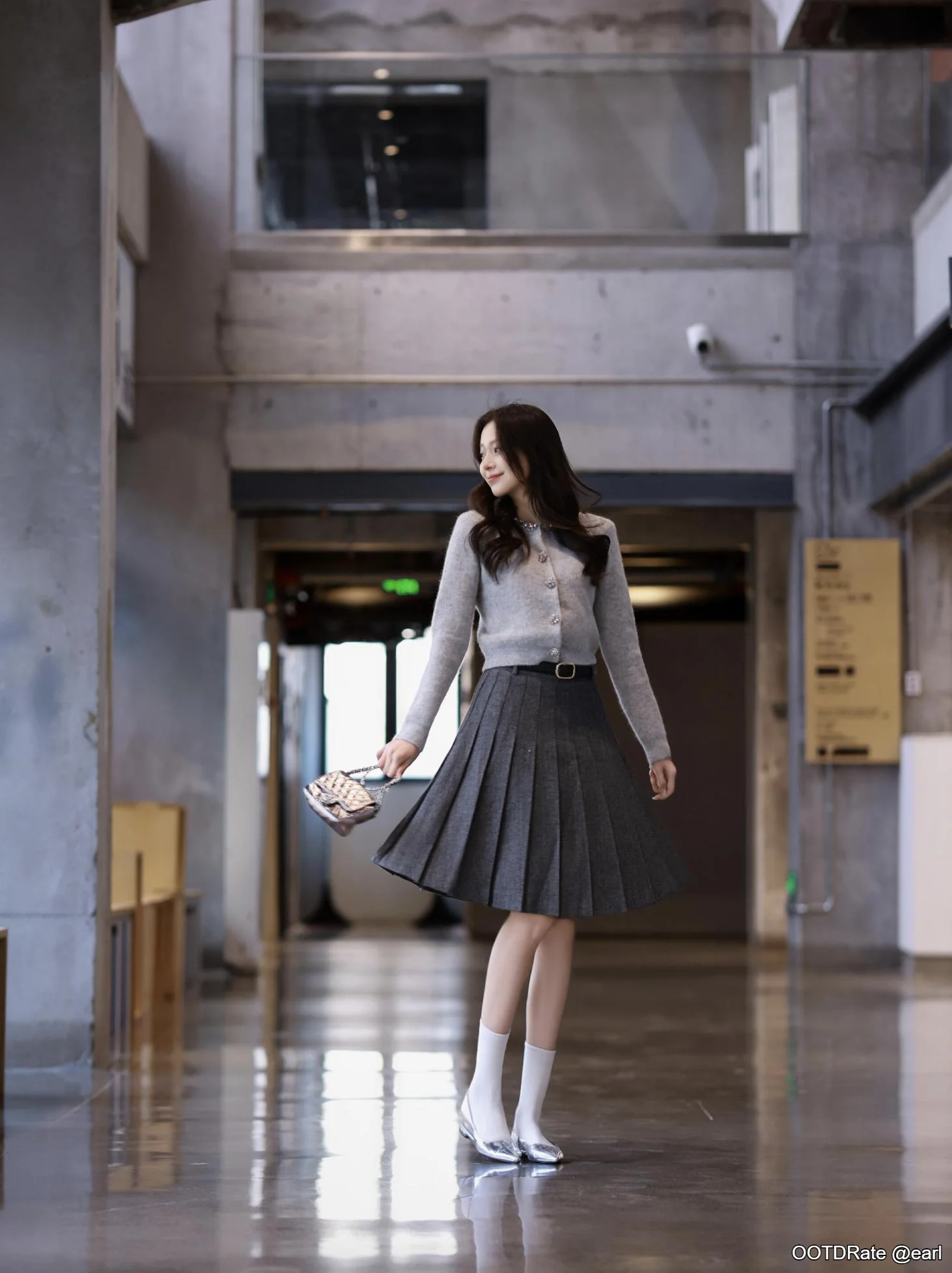 This outfit combines a classic and sophisticated look with a contemporary twist. The grey cardigan is a versatile piece that provides a preppy yet polished vibe. It pairs perfectly with the pleated skirt, also in grey, creating a harmonious monochrome ensemble that feels both cohesive and stylish. The pleated design adds texture and movement, giving the outfit an elegant dynamic.