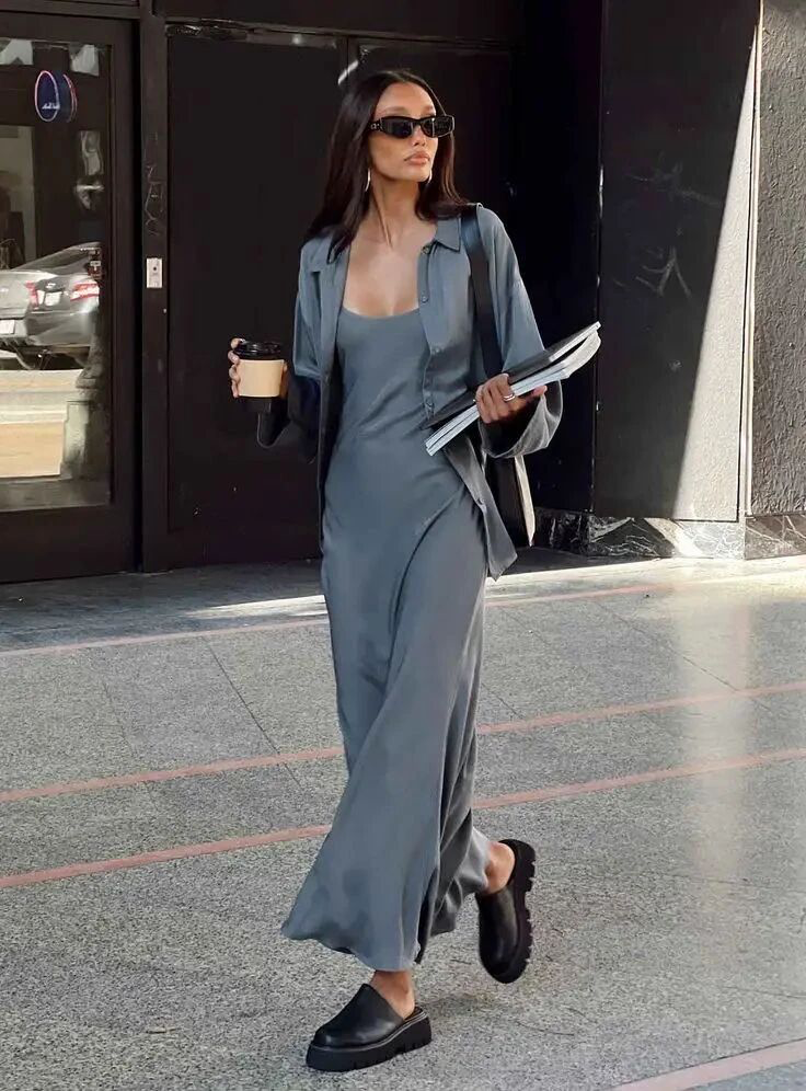Minimalist Elegance: Grey Slip Dress with Layered Shirt and Chunky Loafers