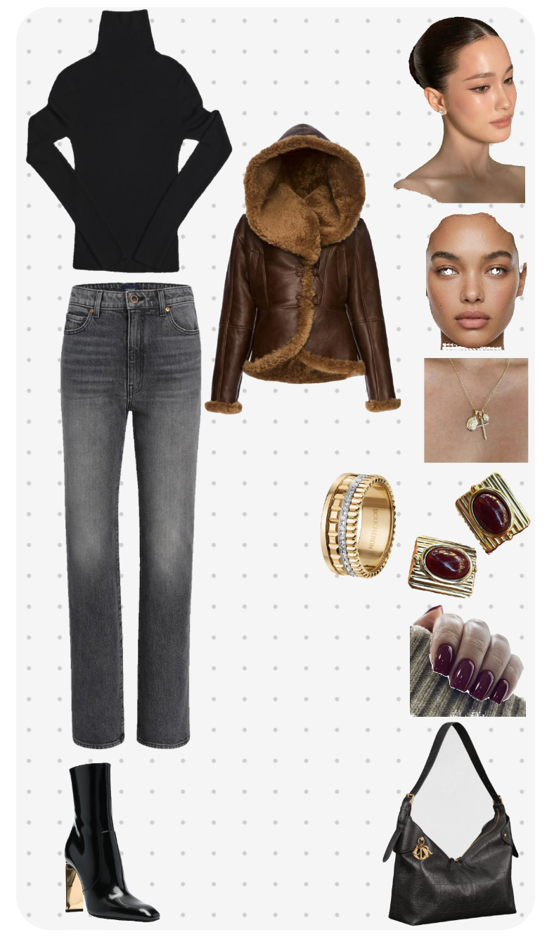 This outfit earns a solid 8.7 out of 10. The combination of a sleek black turtleneck and timeless grey jeans creates a clean and sophisticated foundation. The choice of a brown shearling leather jacket adds warmth and texture, making it an excellent choice for cooler weather while also providing a luxurious touch. The black, patent leather ankle boots with a unique heel add a modern twist, enhancing the overall sleekness of the ensemble.