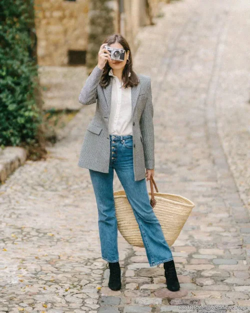 Timeless Gray Blazer with Classic Denim and Chic Straw Bag